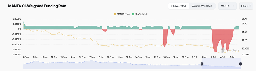 Videre, for første gang siden 4. juni, er MANTAs finansieringsrate på tvers av kryptovalutabørser positiv. I skrivende stund er dette 0,56%.