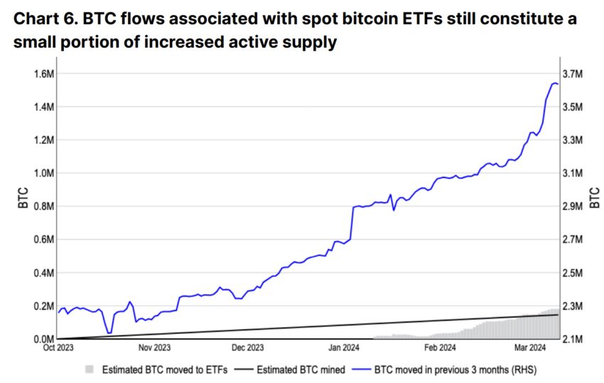 Det er bemerkelsesverdig at det siden begynnelsen av 4. kvartal 2023 har vært en betydelig økning i det aktive BTC-tilbudet, med en økning på 1,3 millioner som overgår den kumulative ETF-innstrømningen. Dette skiftet antyder en dypere endring i markedsatferd, spesielt med tilstedeværelsen av institusjonelle investorer gjennom ETF-er, noe som tilfører et lag med kompleksitet.
