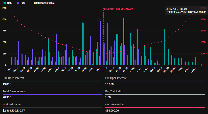 Det har vært en betydelig økning i Bitcoin (BTC) og Ethereum (ETH) kontrakter som forfaller i dag sammenlignet med forrige uke. Ifølge Deribit-data vil 28 905 Bitcoin-opsjonskontrakter utløpe på fredag med en put-to-call ratio på 1,09 og et maksimalt smertepunkt på $ 86 000.