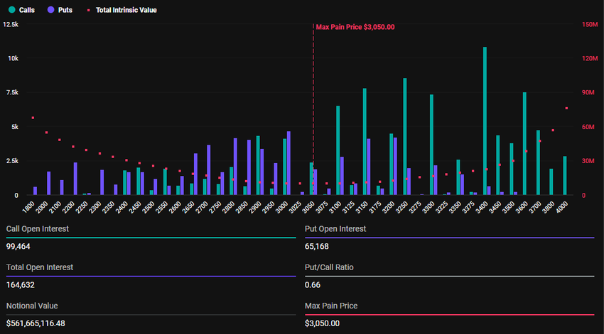 På den annen side er 164 687 Ethereum-kontrakter klare for utløp i dag, med en put-to-call ratio på 0,66 og et maksimalt smertepunkt på $ 3 050.