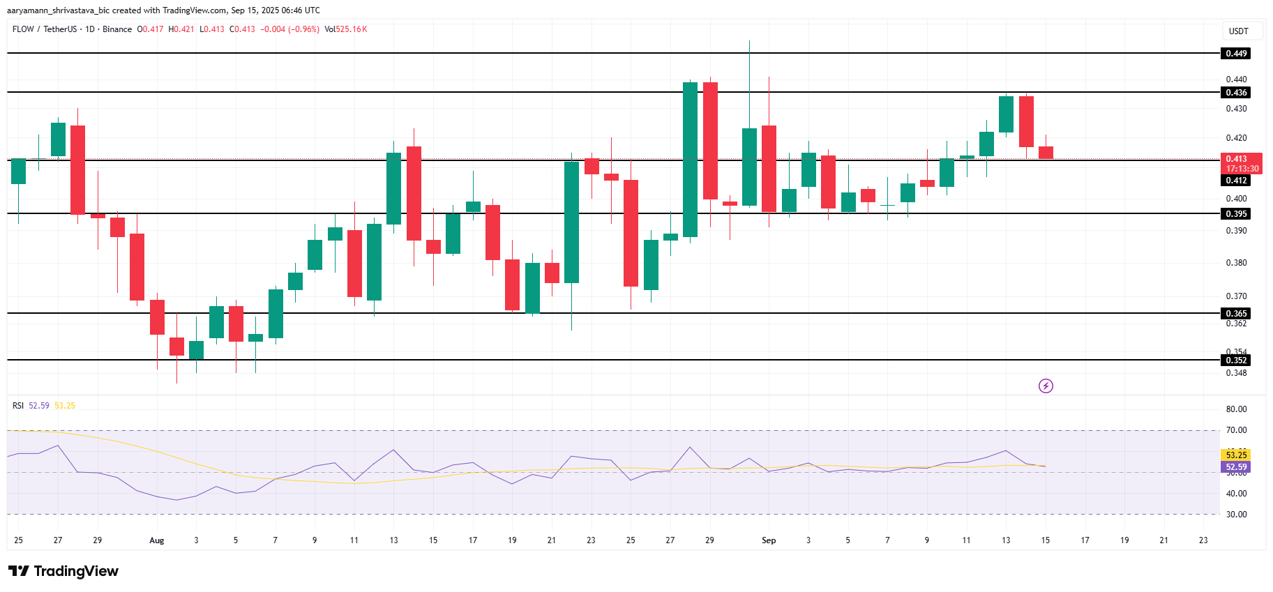 FLOW handles til $ 0,413, og holder seg litt over sitt $ 0,412 støttenivå. Altcoinen viser motstandskraft til tross for nylig volatilitet, og tekniske indikatorer antyder en potensiell oppgang. En stigning fra dette området kan se FLOW klatre mot $ 0,436 i løpet av den kommende uken.