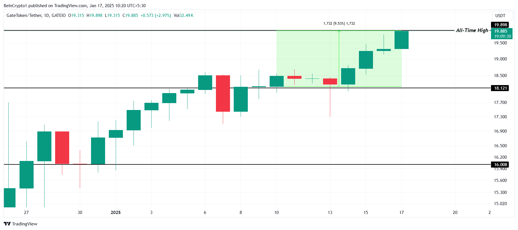 GT kurs økte med 9,5 % denne uken, og nådde en ny all-time high (ATH) på $ 19,89. Denne fortsatte trenden med rekordhøye nivåer fremhever sterk investor tillit og økende etterspørsel etter altcoinen.