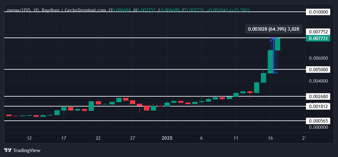 MEOW dukket opp som en av de best presterende altcoins, og steg med 64 % de siste 24 timene. Denne imponerende oppgangen presset prisen fra under $ 0,0050 til $ 0,0077, noe som gjorde den til en fremtredende aktør i markedet.