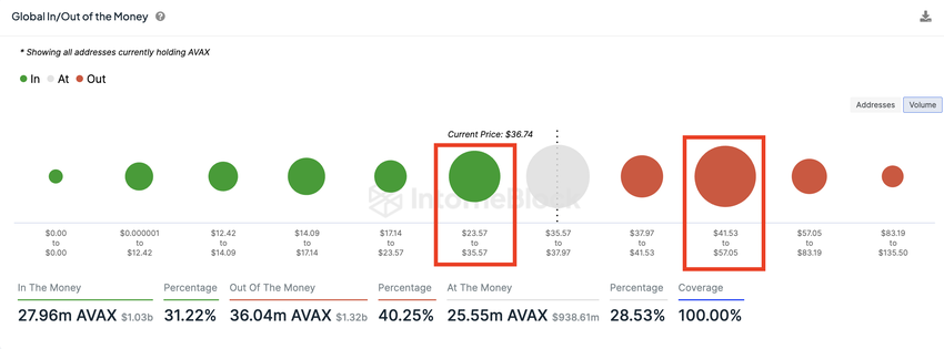 Videre identifiserer den grå boblen en kritisk forsyningssone rundt $ 36,77, der 541 000 adresser har anskaffet omtrent 25,55 millioner AVAX. Dette området kan også fungere som motstand, noe som muligens begrenser prisbevegelser oppover.