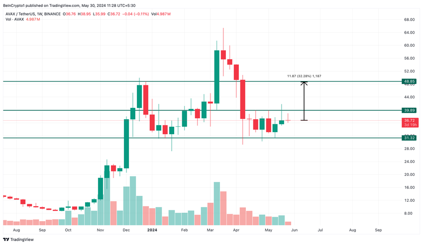 Teknisk analyse bekrefter disse observasjonene, og indikerer at AVAX for tiden konsoliderer mellom $ 31,32 og $ 39,89. Skulle det bryte ut fra dette området, kan prisen øke med 32% mot neste betydelige motstand på rundt $ 48.85.