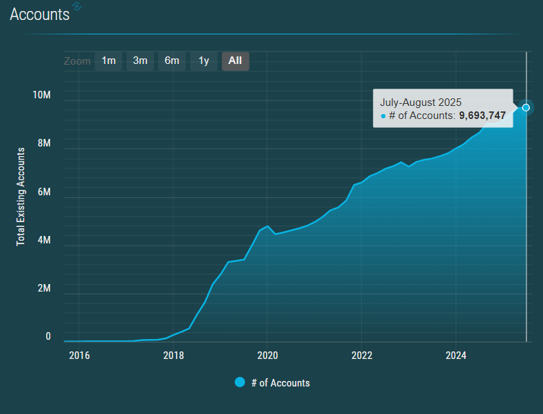 Data fra Stellar Expert indikerer at nettverket har utvidet seg betydelig. Til tross for store markedsopp- og nedturer siden 2016, fortsetter Stellar å vise bred adopsjon.