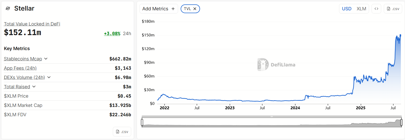 Data fra DeFiLlama viser at Stellars TVL økte fra $ 84 millioner i juli til over $ 150 millioner i august—en økning på over 80 %.