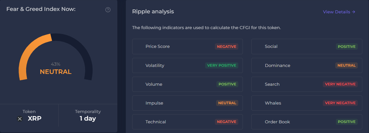 Økt XRP-handelsaktivitet sammenfaller med endret sosialt sentiment. Ifølge CFGI.io har sentimentet bedret seg fra frykt til nøytral. Dette indikerer at markedet for tiden verken er altfor optimistisk eller overdrevent pessimistisk.