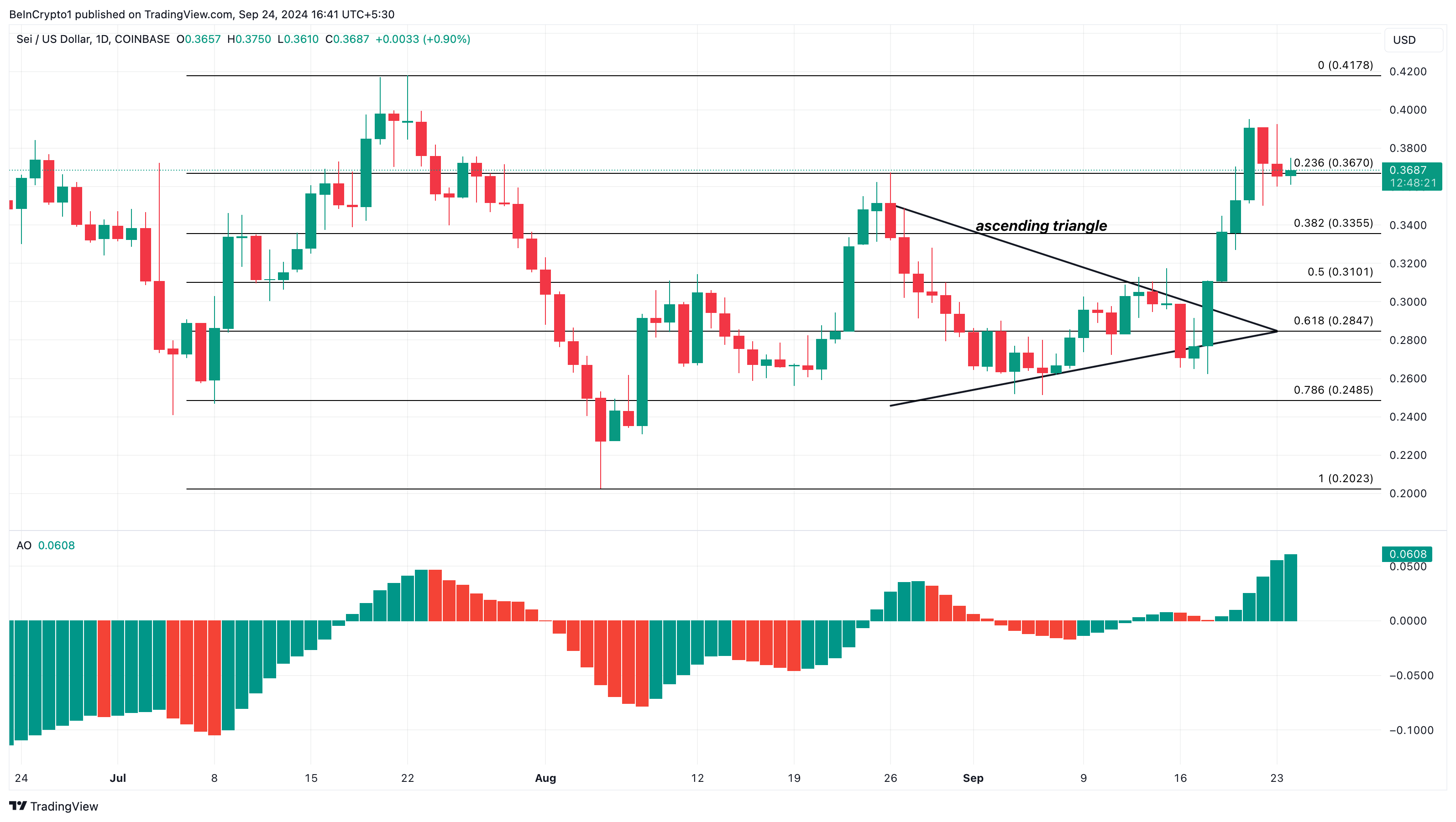 Kjent som en av de raskeste Layer-1-blokkjedene, er Seis opprinnelige token en av altcoinsene som har økt med mer enn 30 %. For øyeblikket handles til $ 0,36, SEI dannet en stigende trekant på det daglige diagrammet mellom 26. august og 17. september. Til slutt brøt token over trekanten, noe som validerte en prisøkning, som hjalp SEI med å klatre med 33 %.