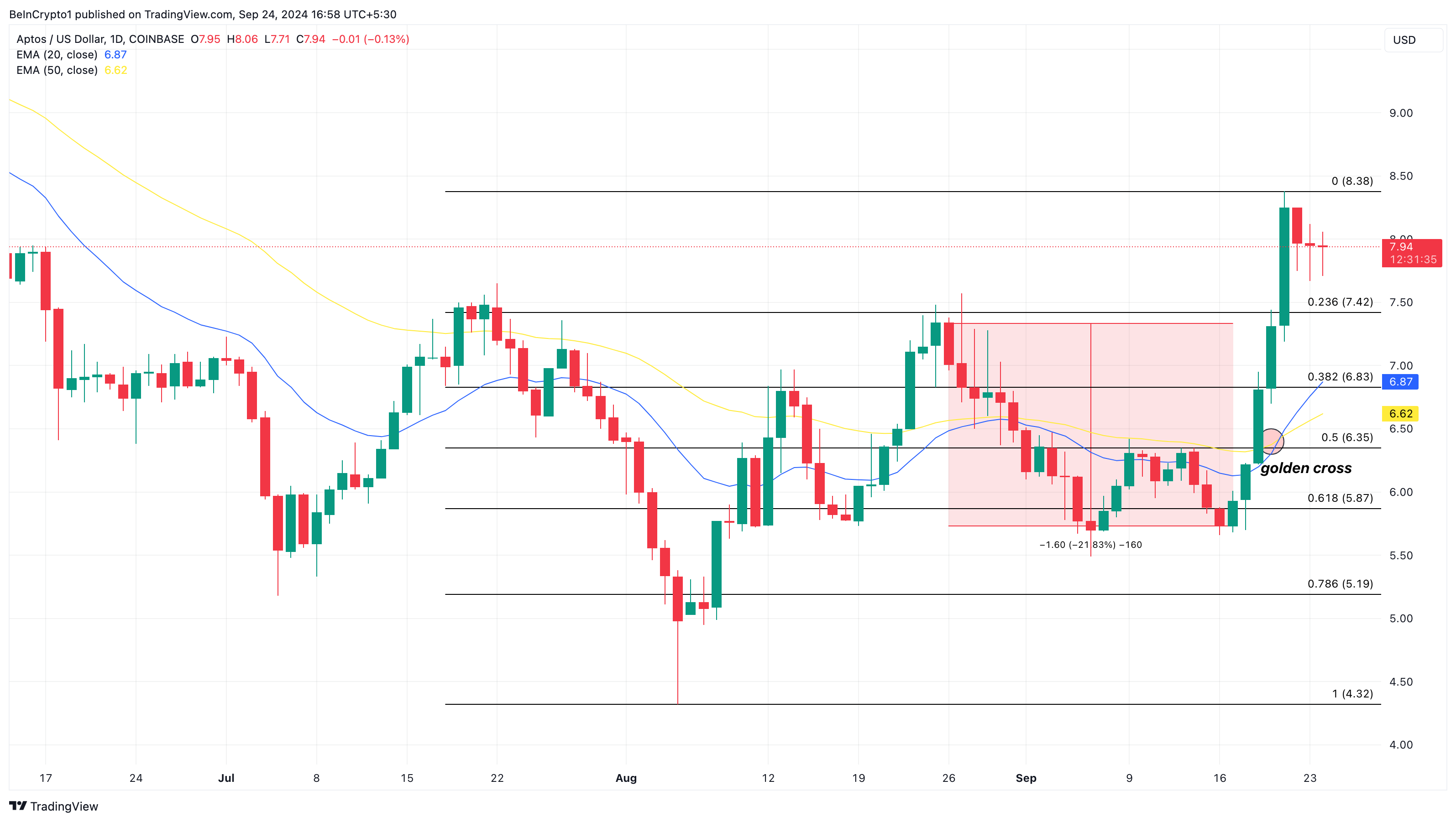 Et annet Layer-1-prosjekt som har prestert betydelig den siste uken er Aptos (APT). I løpet av de siste syv dagene har prisen økt med 32 %. Selv om prisen først falt med 22 %, viser teknisk analyse at et gyllent kryss var avgjørende for tokenets oppgang.