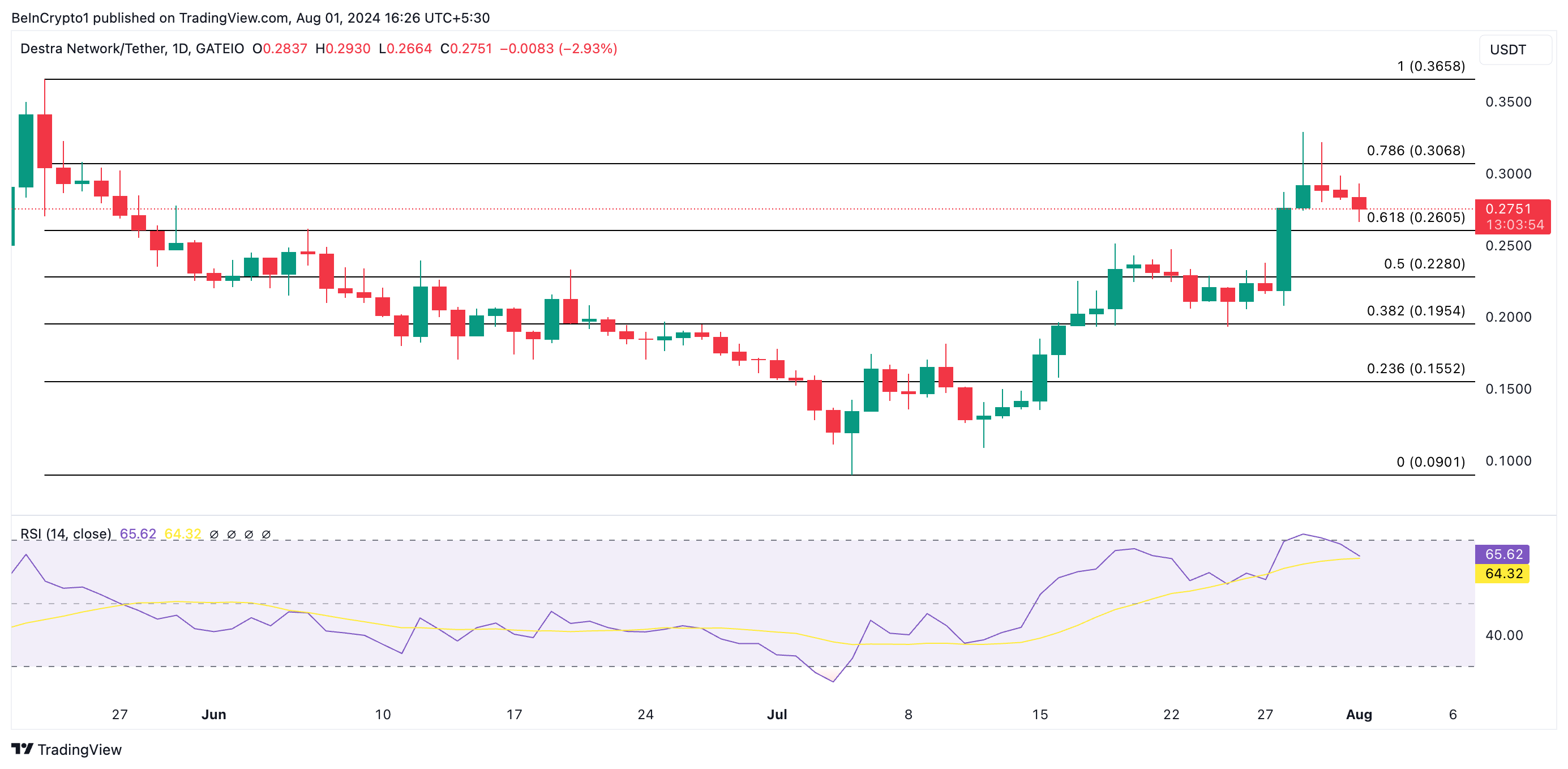 Basert på en daglig graf viser prisbevegelsene at den nylige oppgangen er støttet av faktisk etterspørsel etter altcoinen. Dette bevises av dens stigende Relative Strength Index (RSI). I skrivende stund er den viktige momentumindikatoren på en oppadgående trend ved 65,14.