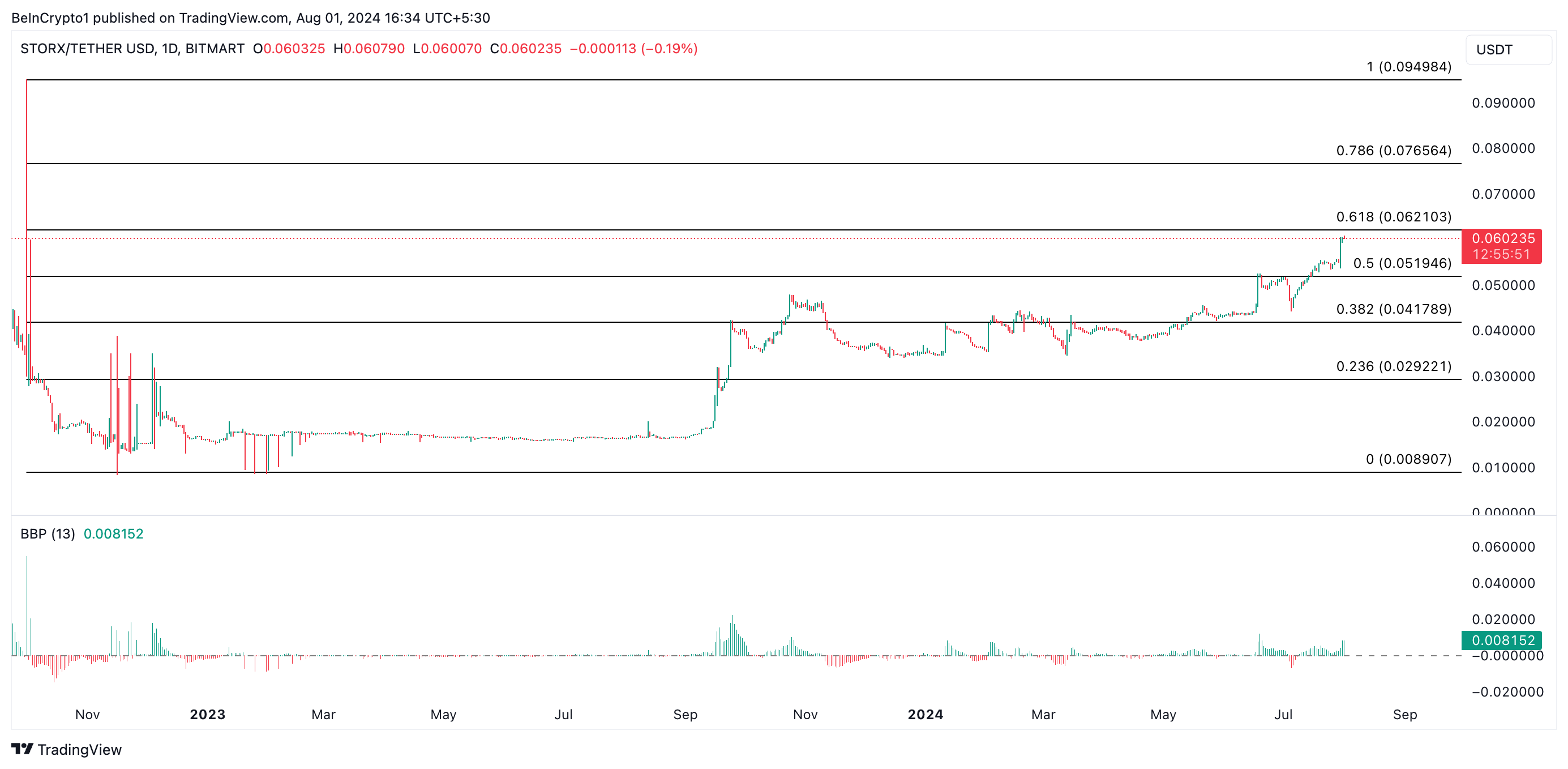 Handles til $ 0,60 i skrivende stund, og altcoinen handles på en månedlig topp. Tokenet nyter en betydelig bullish bias, bevist av sin positive Elder-Ray-indeks. I skrivende stund er indeksens verdi 0,0081.