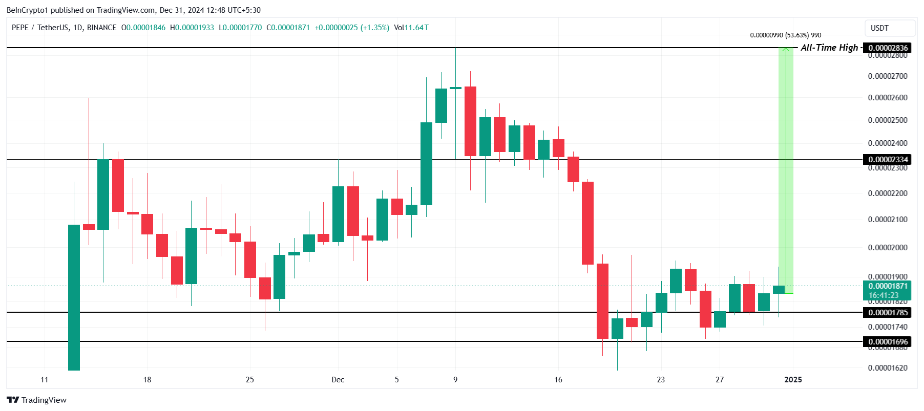 For øyeblikket handles PEPE til $ 0,00001871 og vil trenge en økning på 53 % for å nå tilbake til sin all-time high på $0,00002836. Altcoinen forsøker å etablere $ 0,00001785 som et støttenivå. Å gjenvinne $ 0,00002334 som støtte vil være essensielt for at PEPE skal signalisere en bullish trend, og tilby en mulighet for potensiell oppgang.