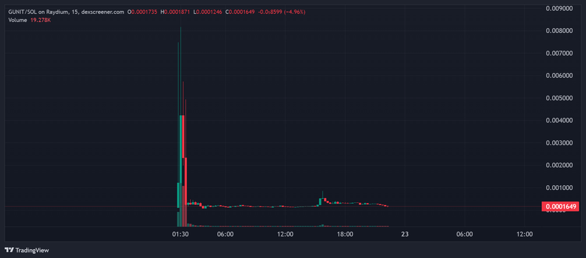 Rapperens innlegg inkluderte bilder av andre brukere i kryptosamfunnet som diskuterte GUNIT-meme-mynten, med diagrammer som viste en kraftig prisstigning etterfulgt av en bratt nedgang. Under sin topp i går nådde GUNIT så høyt som $0,008148 klokken 18:30 UTC. I skrivende stund handles GUNIT til $0,0001649, med en markedsverdi på $191,000.