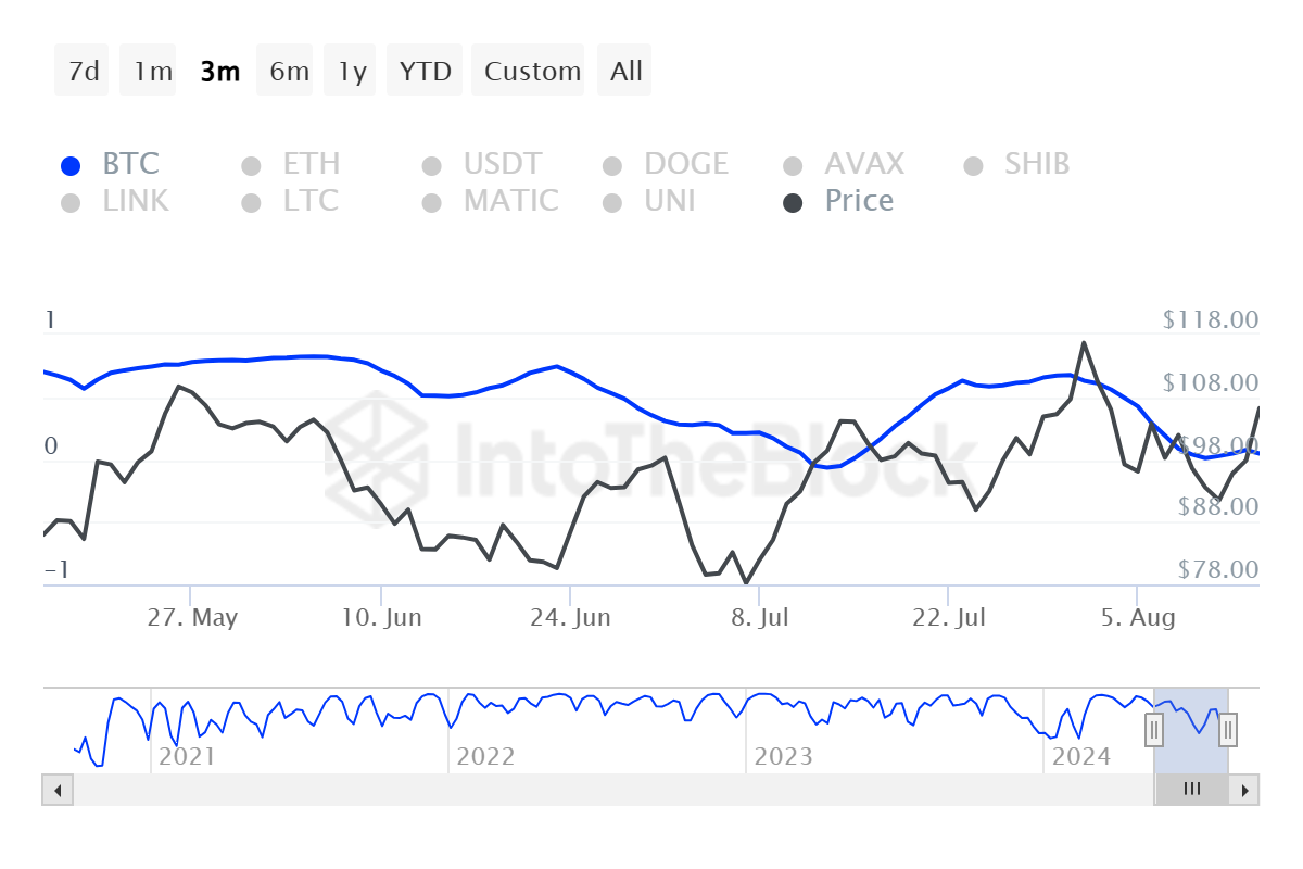Likevel har altcoinen potensial til å motvirke denne potensielle bearishheten. Korrelasjonen mellom AAVE og Bitcoin har falt til et lavt nivå på 0,03. Dette betyr at altcoinen nesten har løsrevet seg fra kongen av krypto.