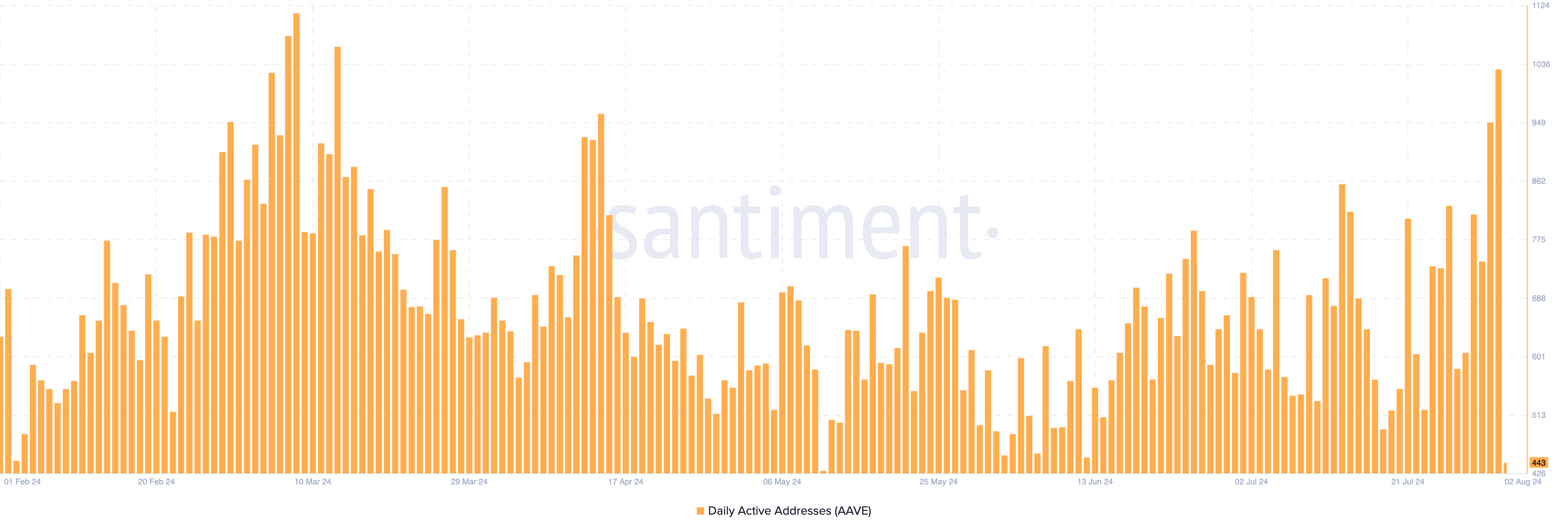 AAVEs handelssesjon på torsdag så en rekke flermåneders høyder, med Santiment som rapporterer at altcoinens daglige aktive adresser nådde sitt høyeste nivå siden mars. Den dagen fullførte 1029 unike adresser minst én handel som involverte AAVE.