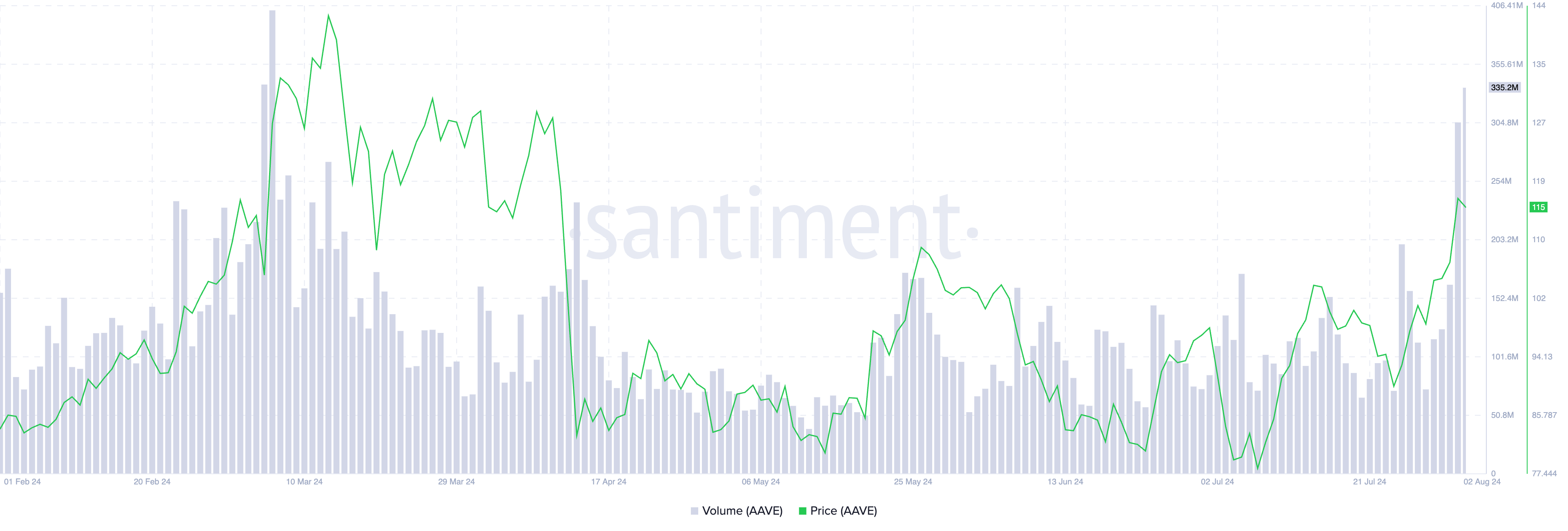 On-chain data viser en 95 % økning i AAVEs handelsvolum de siste 24 timene. I skrivende stund er tokenets daglige handelsvolum på $ 335 millioner, noe som representerer det høyeste siden 6. mars.