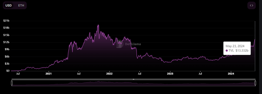 Aave, en ledende kryptolåneprotokoll på Ethereum-nettverket, har opplevd betydelig vekst i sin totale verdi låst (TVL), og har økt med 2.26 milliarder dollar siden mandag. I følge DeFiLlama-data brakte denne økningen Aaves TVL til 13,33 milliarder dollar, som markerer det høyeste nivået siden mai 2022.