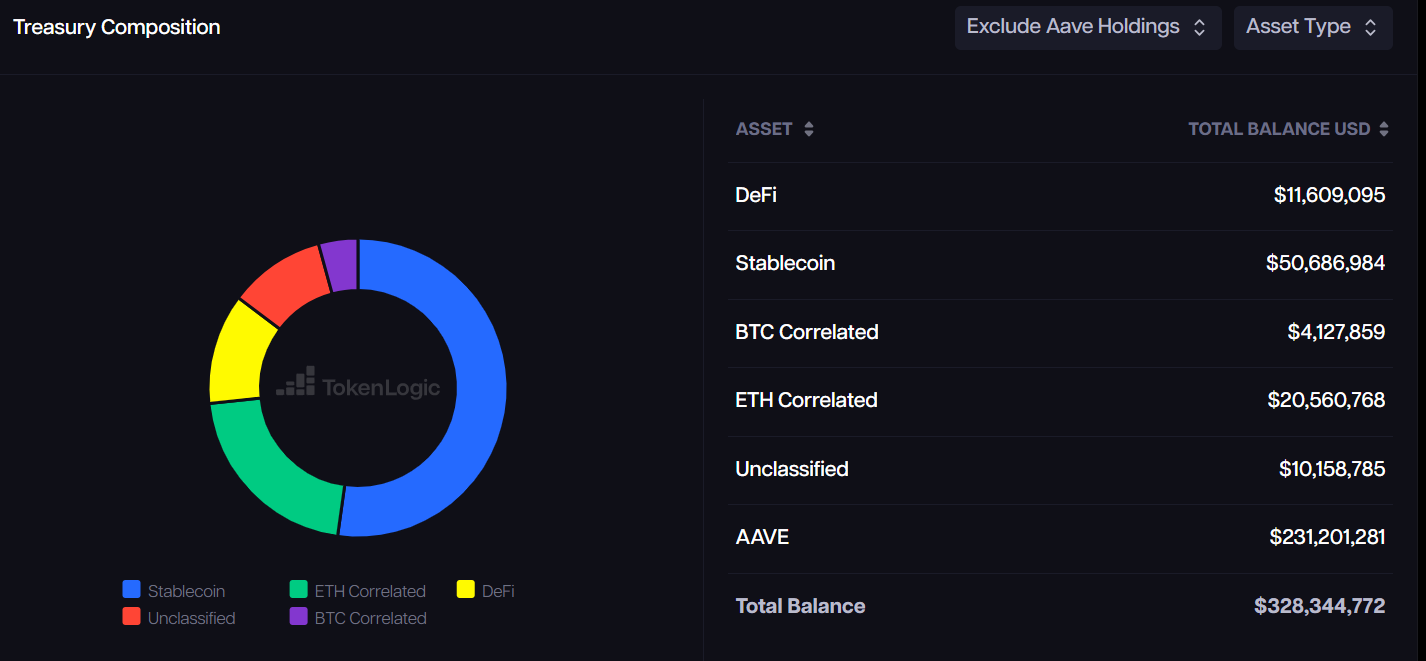 Aaves sterke økonomiske posisjon støtter dette initiativet. Dets kasse inneholder nesten $ 100 millioner i ikke-naturlige aktiva, inkludert stablecoins, Ethereum og andre kryptovalutaer. Når man tar med AAVE-tokens, overstiger dette tallet $ 328 millioner, ifølge TokenLogic.