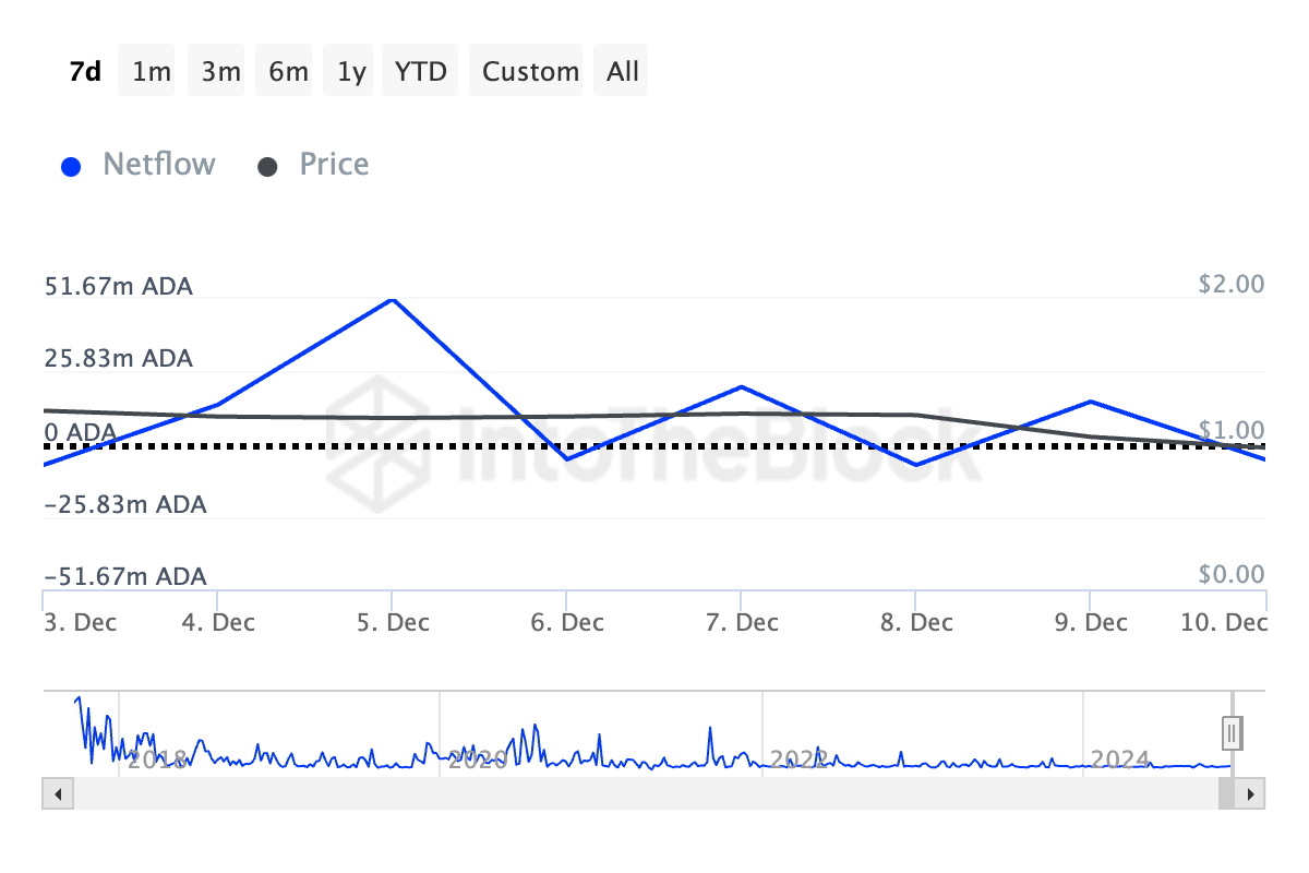 Nedgangen i Cardanos store innehaveres nettoflyt, en metrikk som sporer kjøps- og salgsaktiviteten til store investorer eller hvaler, bekrefter en reduksjon i ADA-akkumulering av denne gruppen av myntinnehavere. IntoTheBlocks data viser at ADAs store innehaveres nettoflyt har stupt med 139 % de siste syv dagene.