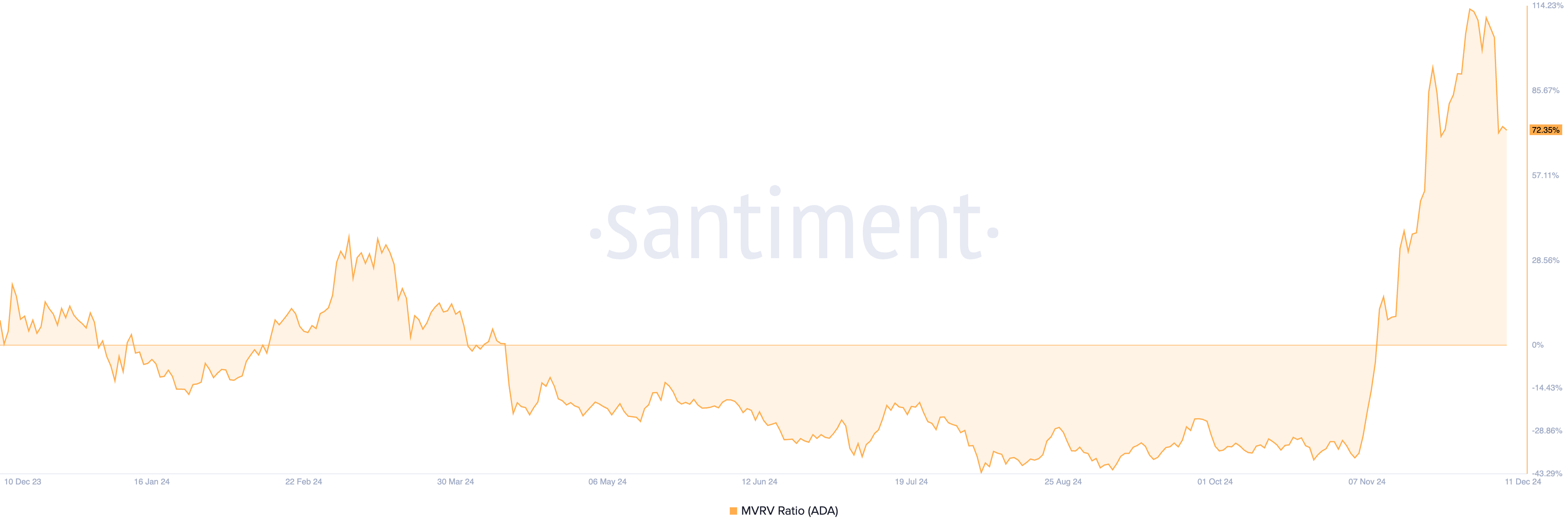 Som støtte for denne følelsen har altcoinens Market Value to Realized Value (MVRV) ratio vist en jevn nedgang. Data fra Santiment indikerer at MVRV-ratioen nådde en topp på 113 % den 2. desember før den begynte sin nedadgående bane. I den siste oppdateringen står den på 72,35 %.