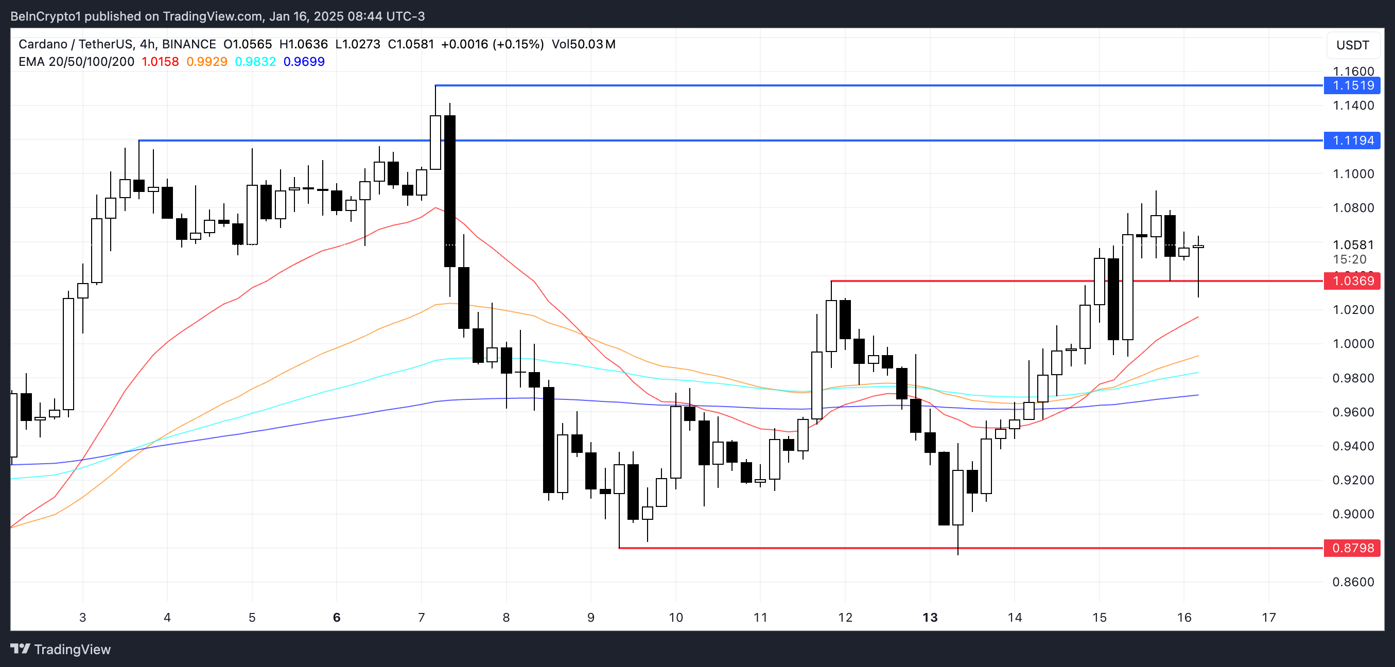 Cardano Exponential Moving Average (EMA) linjer viser for øyeblikket en bullish oppstilling, med kortsiktige EMAer plassert over langsiktige.