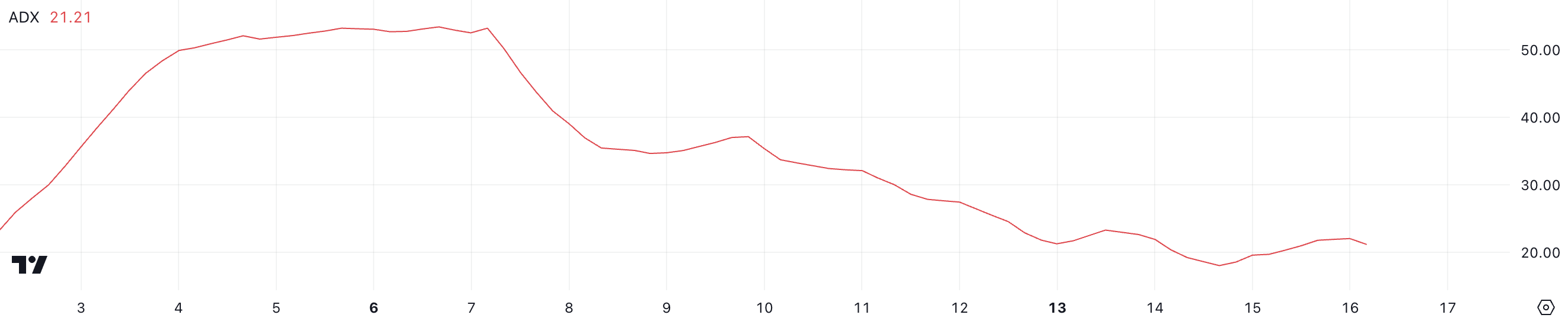 ADX måler trendstyrke på en skala fra 0 til 100, uavhengig av trendretning. Verdier under 20 indikerer et svakt eller range-bound marked, mens verdier over 25 antyder en sterk trend. Med ADA ADX på 21,2, nærmer trenden seg meningsfull styrke, men har ennå ikke fullt ut bekreftet sin robusthet.