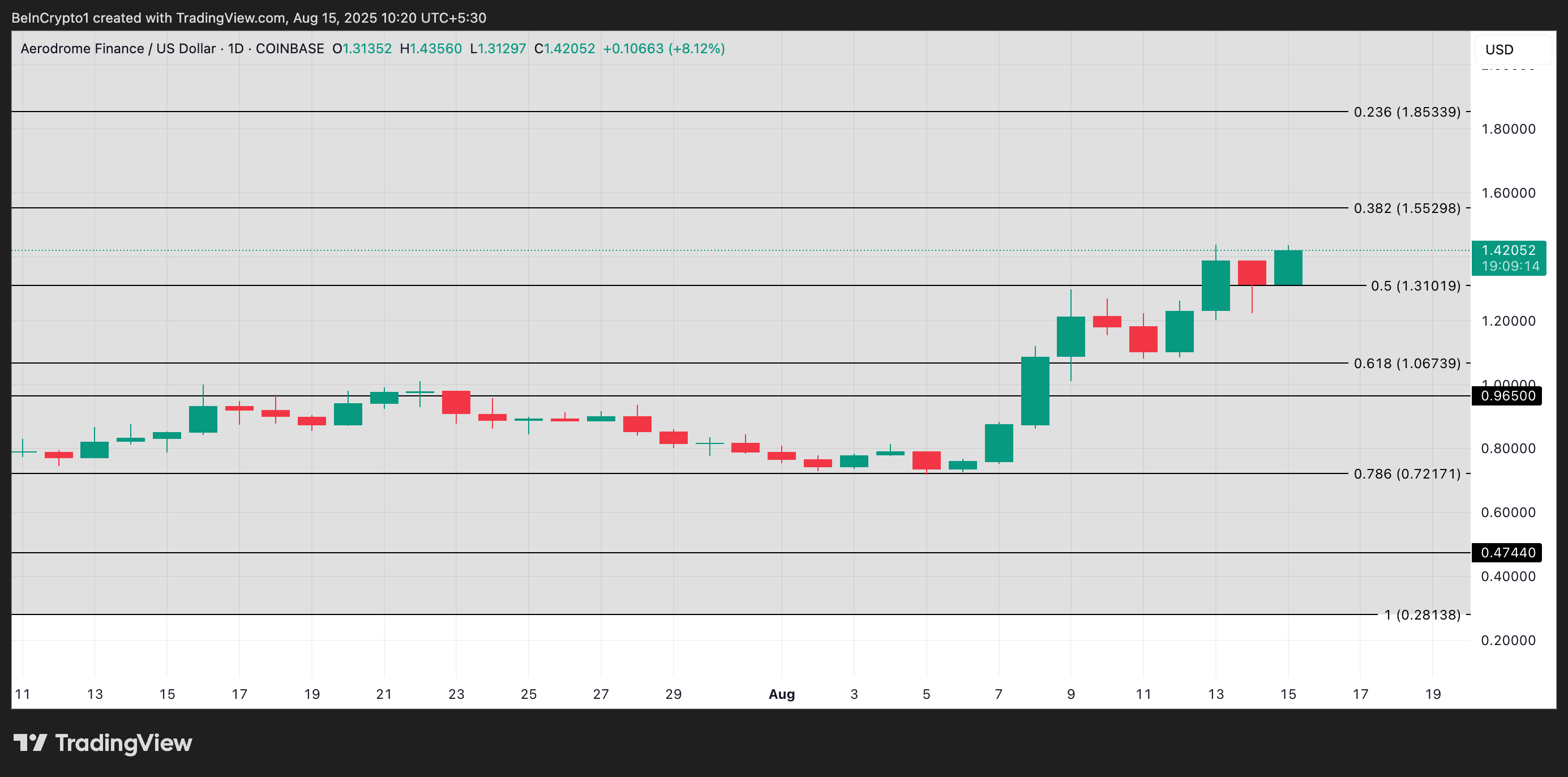 Men hvis oksene gjenvinner dominans og reell etterspørsel etter AERO gjenopptas, kan prisen forlenge sin oppgang til $ 1,55. Et brudd på dette nivået kan åpne døren for en oppgang mot $ 1,85.