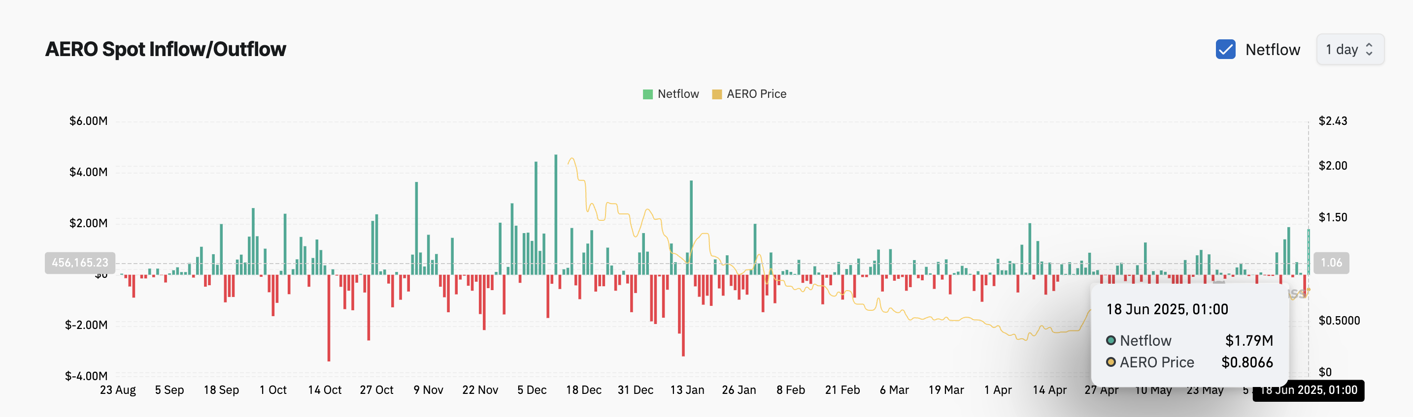 Når en aktiva ser en økning i sin spotinnstrømning, kjøper flere investorer den direkte på børser, noe som signaliserer sterk etterspørsel. Dette reflekterer økende tillit til AEROs prisrally og kan bidra til å drive ytterligere oppadgående momentum. I motsetning til derivater viser spotinnstrømninger reell kapital som kommer inn i markedet, noe som gir tyngde til den bullish stemningen i AERO-markedet.