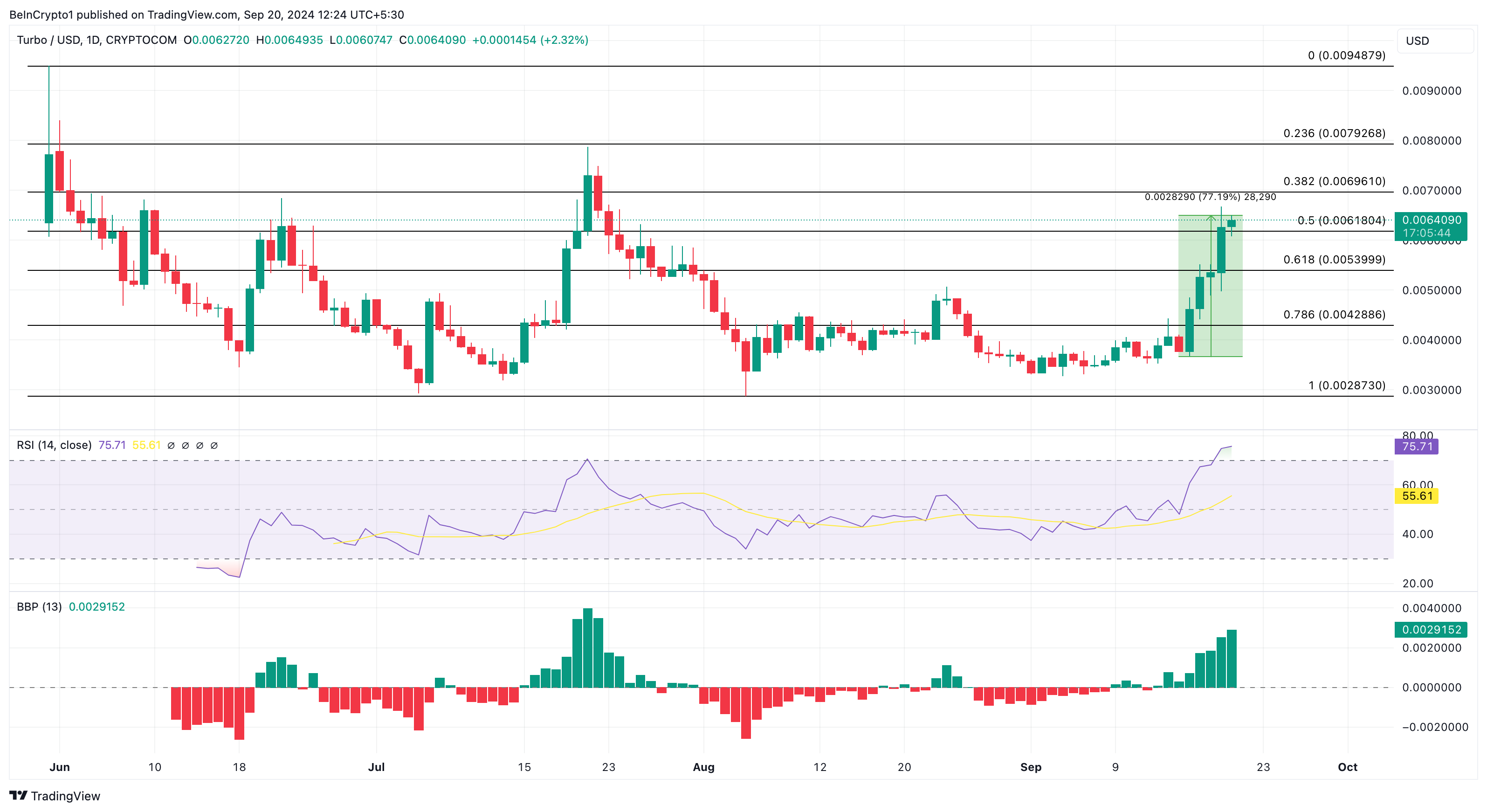 Det daglige diagrammet viser at Relative Strength Index (RSI) indikerer at TURBO er overkjøpt, med en verdi på 75,64. RSI måler markedsmomentum, og verdier over 70 antyder overkjøpte forhold, mens verdier under 30 indikerer at en aktiva er oversolgt.