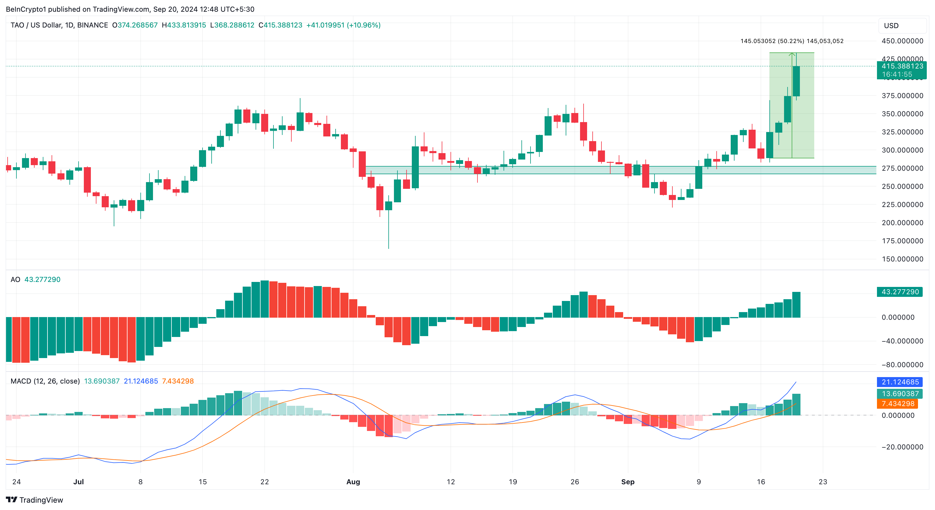 Basert på det daglige diagrammet viser Awesome Oscillator (AO), en indikator brukt til å måle markedsmomentum, stigende histogramstolper. Dette indikerer bullish momentum rundt Bittensor-tokenet.