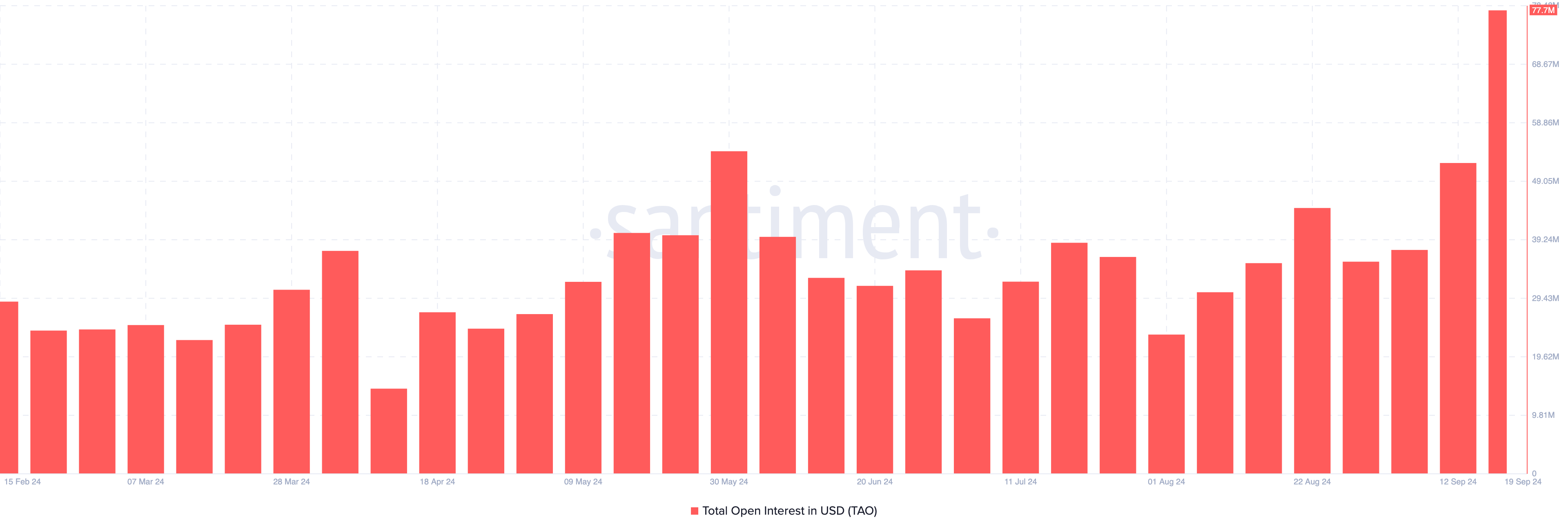 For utallige gang, er TAO en av de topp AI-myntene som har prestert godt denne uken. Med en pris på $ 415,38 har TAOs pris økt med 50 % siden 17. september. Videre viser kjededata fra Santiment at den åpne interessen (OI) rundt kryptovalutaen nådde sitt historiske høydepunkt.