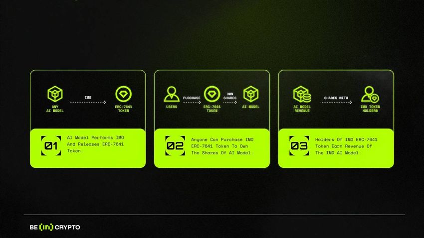 - ERC-7641 er en tokenstandard som er kompatibel med ERC-20. For å lansere en IMO kobler utviklere modellen til en ERC-7641-aktiva og angir tokennumre i smartkontrakten. Investorer kjøper disse tokenene og får eierskap i AI-modellen proporsjonalt med sin token-andel, på samme måte som aksjonærer. ERC-7641-protokollen fastsetter regler for overskuddsfordeling i kontrakten, noe som muliggjør automatisk overskuddsdeling basert på tokenbeholdningen.