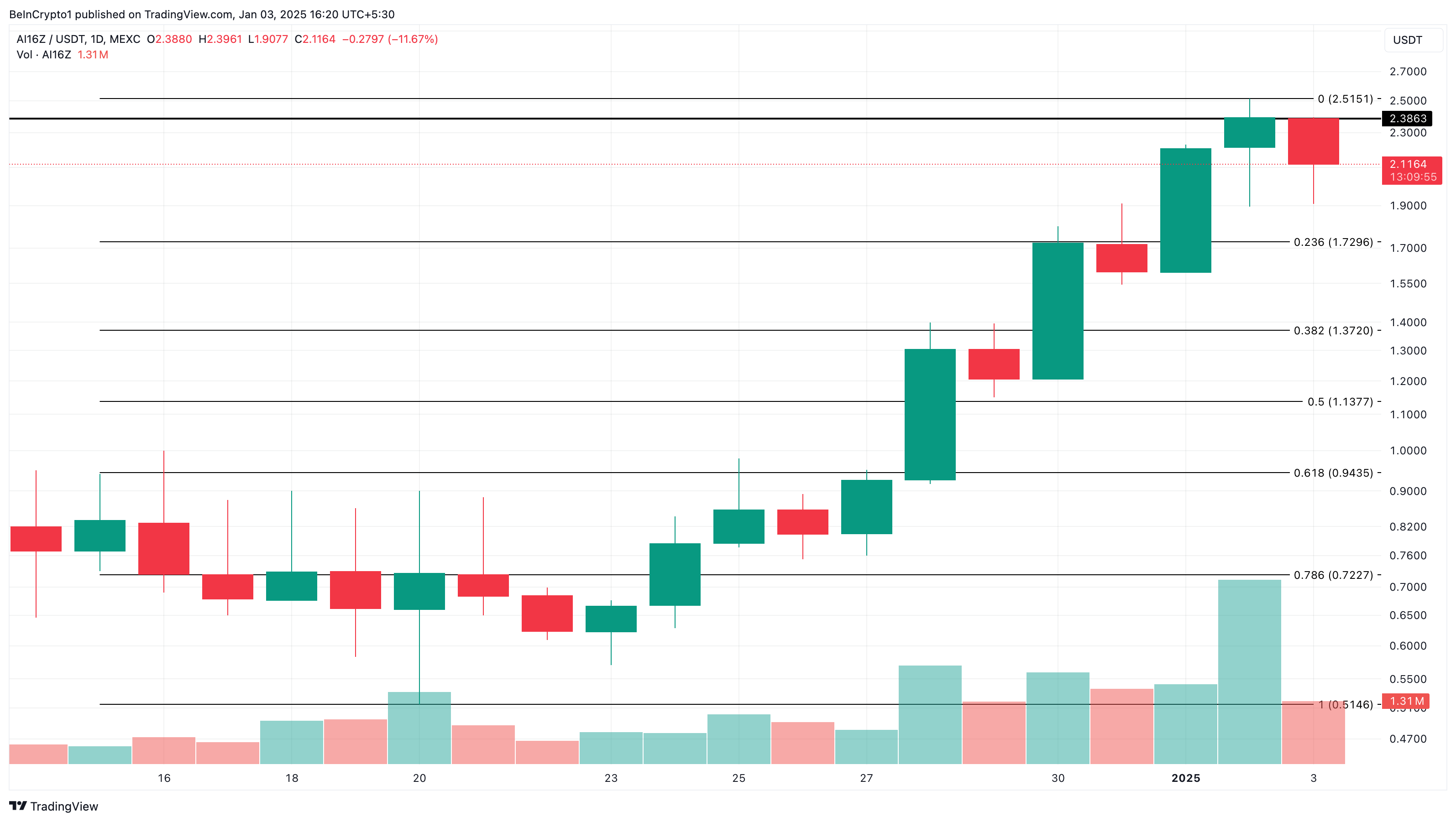 Hvis dette bekreftes, kan AI-agenten AI16Z prisen synke til $1,73. På den annen side, hvis okser klarer å snu motstanden til støtte, kan dette ikke skje. I stedet kan tokenets verdi stige mot $3.