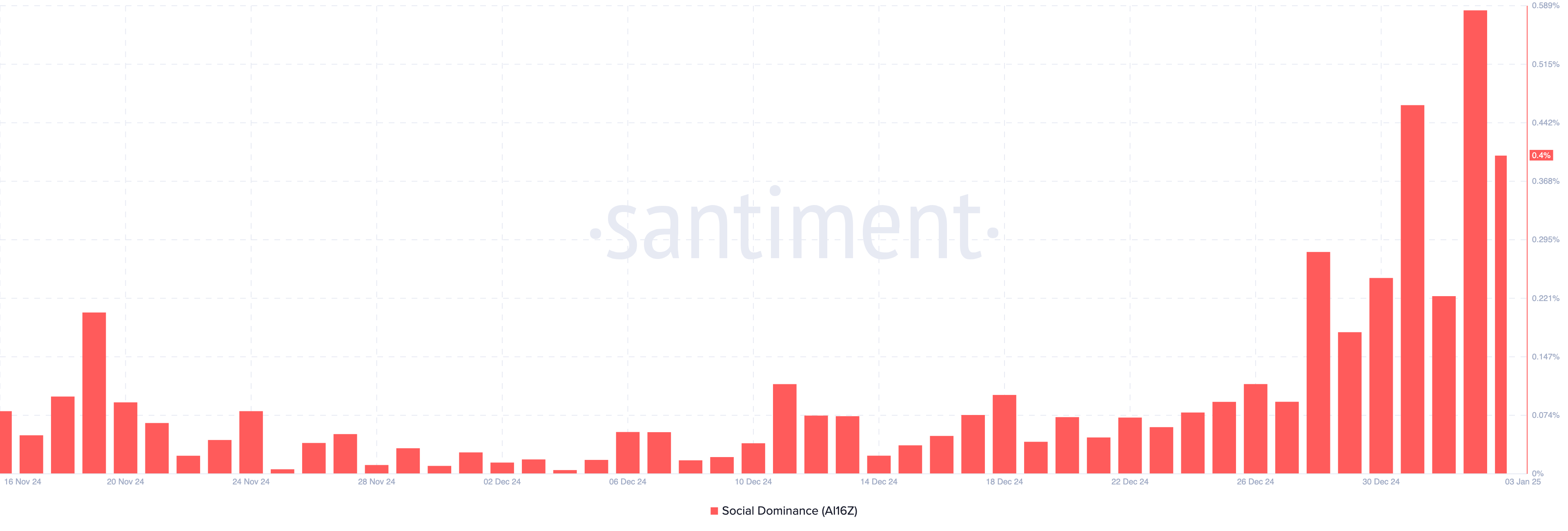 Videre observerte BeInCrypto at oppmerksomheten AI16Z mottok, drev dens sosiale dominans til å nå 0,58 %. Men i skrivende stund har målingen falt til 0,40 %.