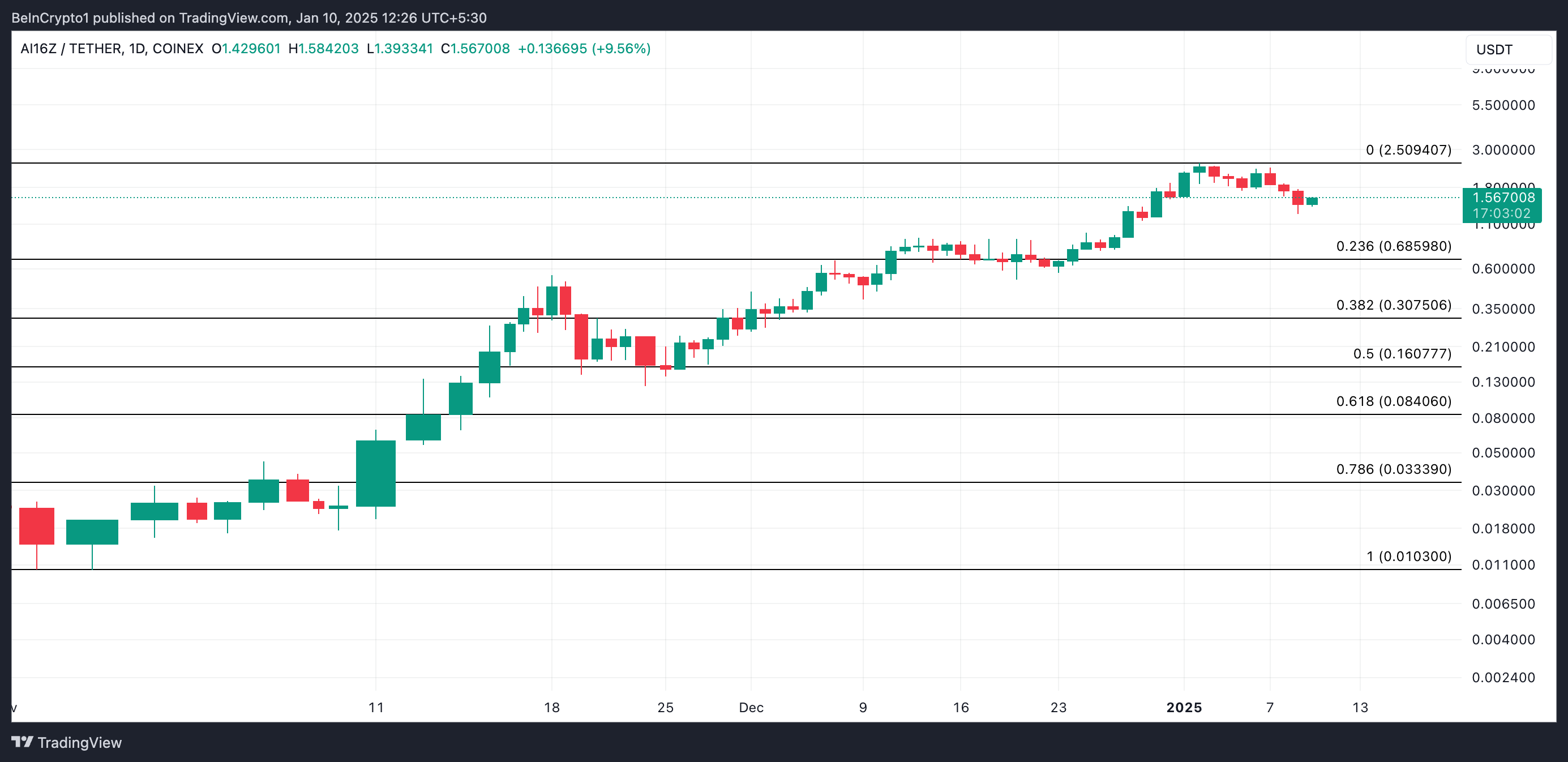 På presstidspunktet handles AI16Z til $ 1,56. Ifølge dens Fibonacci Retracement-verktøy kan økende bearish press føre til at tokenens pris faller under $ 1, potensielt ned til $ 0,68.