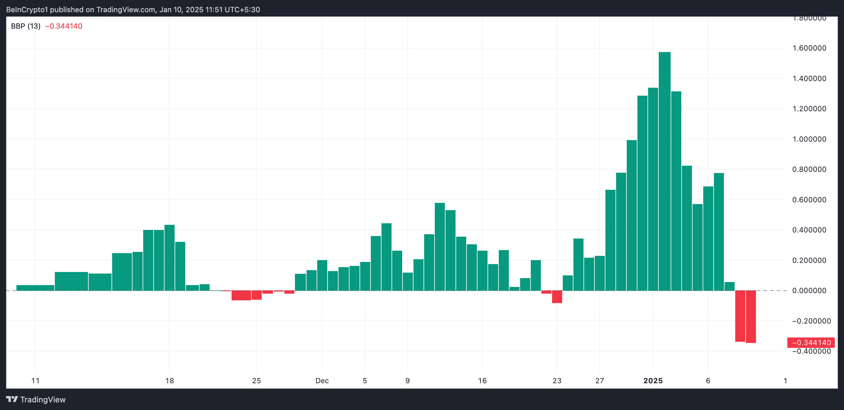 Denne momentumindikatoren måler kjøps- (bull power) og salgs- (bear power) press i markedet ved å sammenligne en aktivas høyeste og laveste priser med dens eksponentielle glidende gjennomsnitt.
