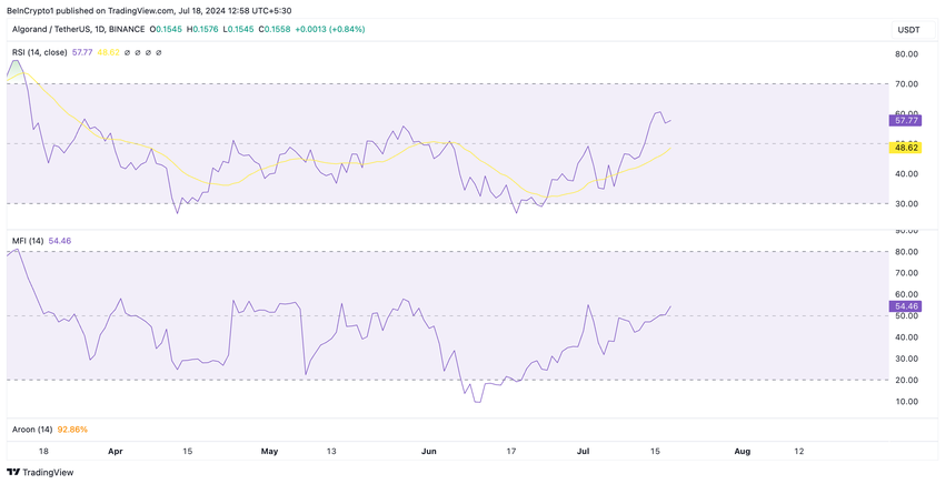 De nåværende RSI- og MFI-verdiene for ALGO indikerer økende kjøpspress, som begynner å overgå salgsaktiviteten. Dette tyder på en økende etterspørsel etter altcoin.