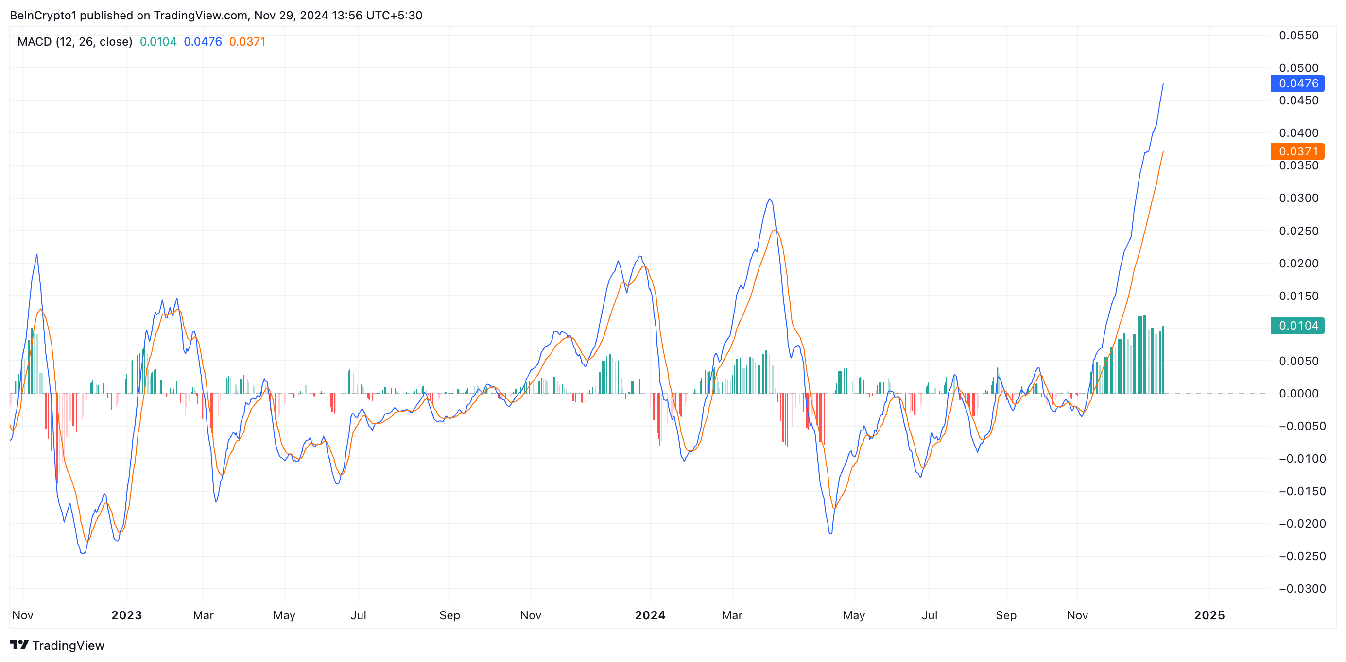 Denne indikatoren måler et aktivums prisutvikling og momentum og identifiserer potensielle vendepunkter. Som i ALGOs tilfelle, når MACD-linjen er over signallinjen, opplever aktivumets pris oppadgående momentum, noe som signaliserer en kjøpsmulighet. Dette krysset indikerer at kortsiktige gevinster overgår langsiktige trender, noe som reflekterer positiv markedsstemning.