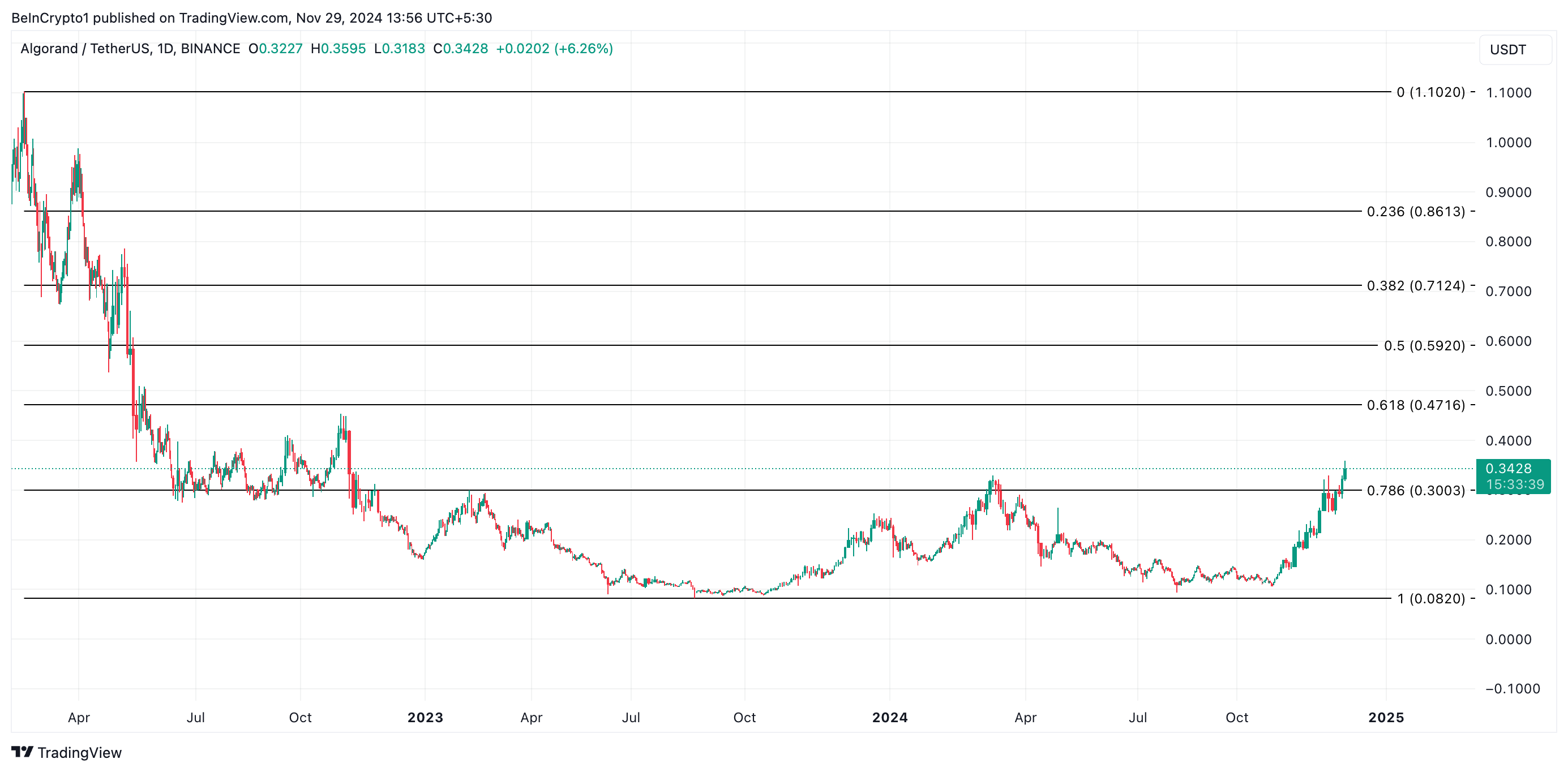 For tiden priset til $ 0,34, holder ALGO seg stabil over kritisk støtte på $ 0,30. Hvis dette nivået styrker seg som et solid støttenivå, kan det drive altcoinen mot $ 0,47. Et brudd over denne motstanden kan potensielt presse den forbi $ 0,50-merket og bringe $ 1 i sikte.