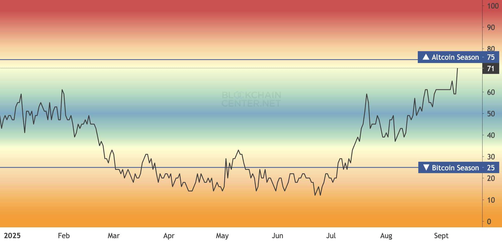 I følge Blockchain Center-data har Altcoin Season Index steget kraftig fra 59 i går til 71 på pressetidspunktet. Vanligvis indikerer en avlesning over 75 starten på en altseason, hvor 75 % av de 50 beste altcoins overgår Bitcoin over en 90-dagers periode.