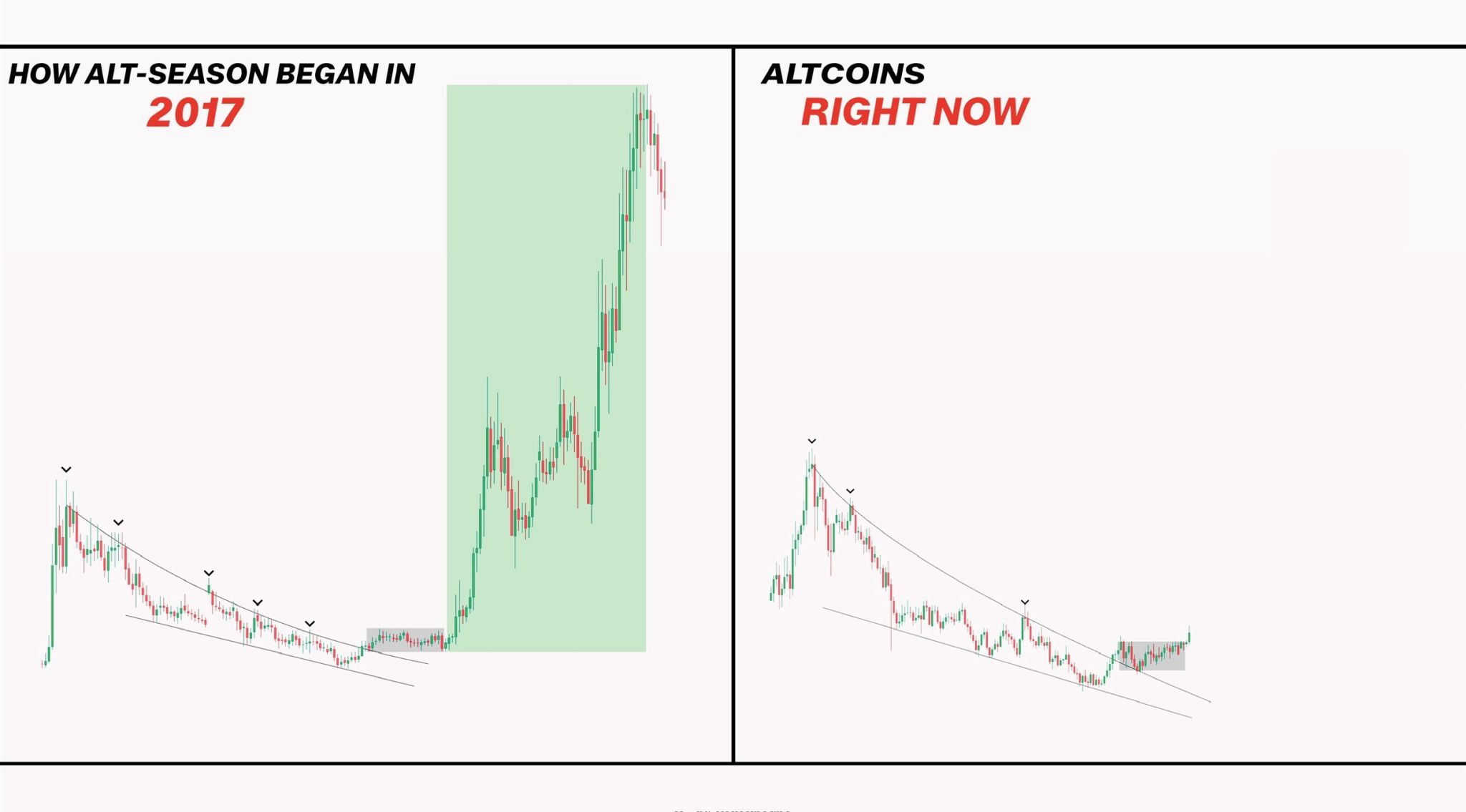 Fra et teknisk perspektiv trakk en annen analytiker paralleller til historiske mønstre. Han beskrev at i 2017 brøt altcoins ut etter betydelig tid i konsolidering, noe som utløste en av de mest dramatiske oppgangene i kryptohistorien.