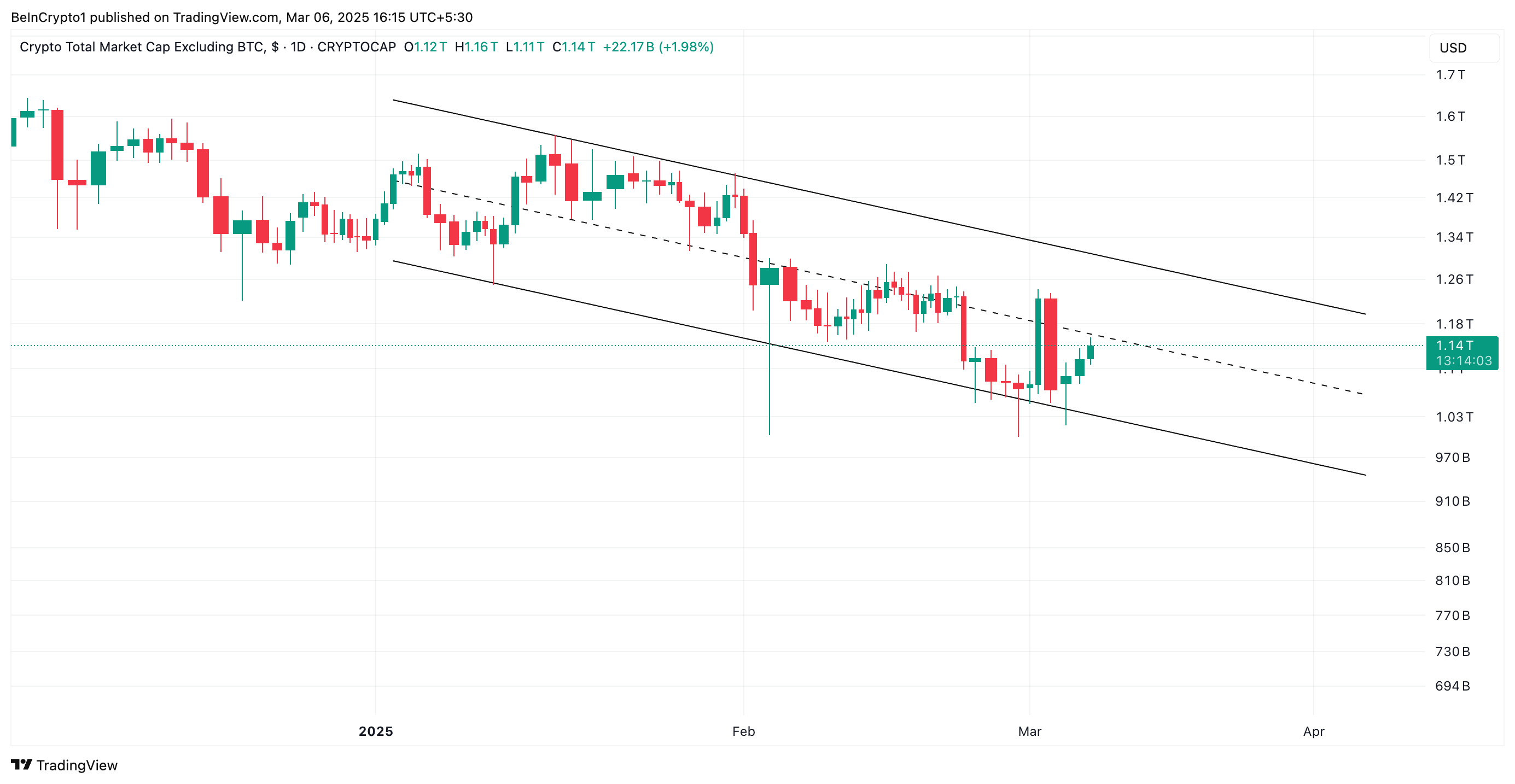 Dette mønsteret signaliserer en vedvarende nedadgående trend. Det dannes når en aktivas pris beveger seg mellom to nedadgående parallelle trendlinjer, med lavere topper og lavere bunner over tid. I skrivende stund er TOTAL2 på $1,14 billioner, og har falt med 17 % siden 1. januar.