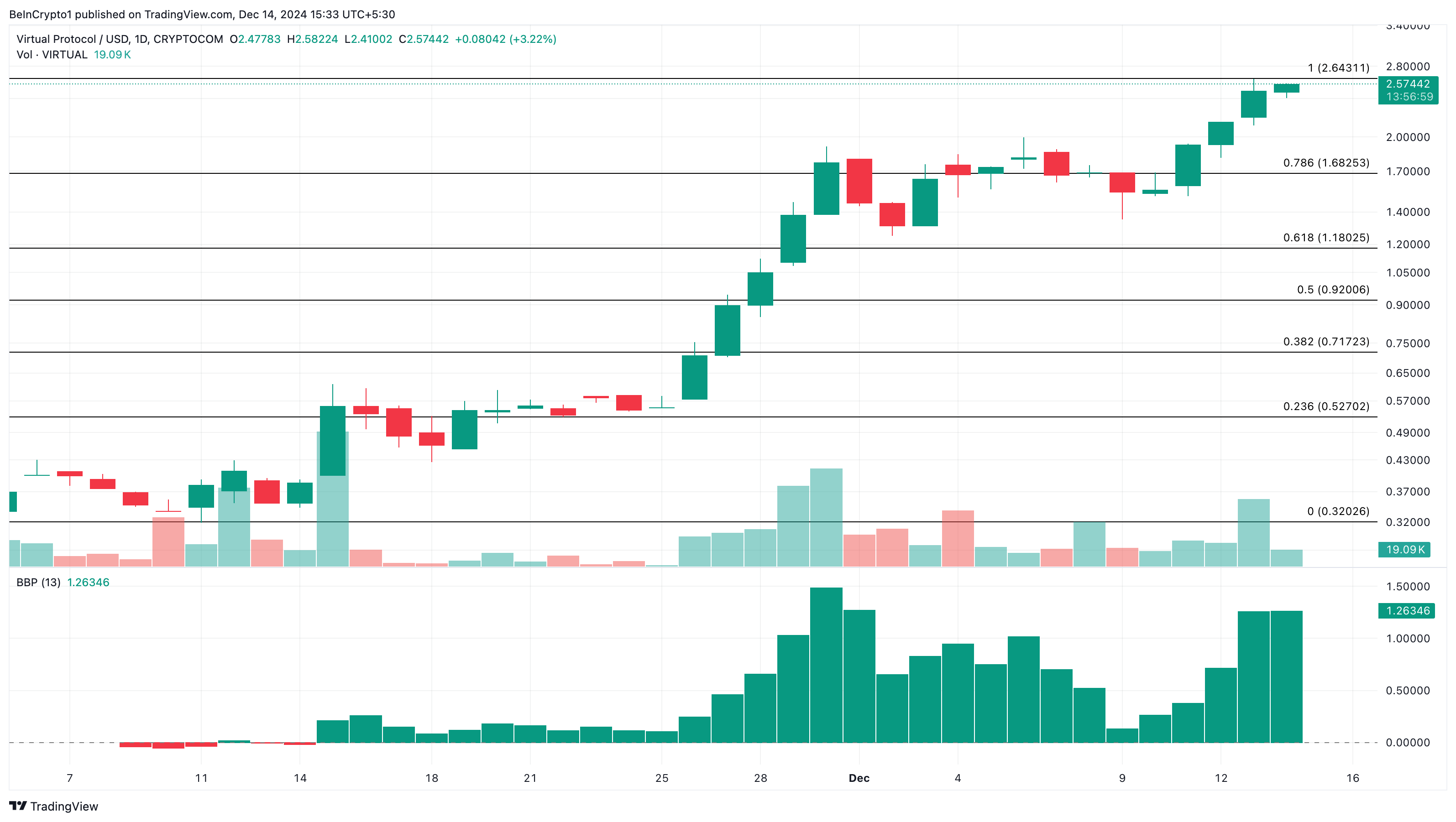 Som et resultat steg VIRTUALs pris med 41,50 % denne uken og handles for tiden til $ 2,57. På det daglige diagrammet er Bull Bear Power (BBP) i det positive området, noe som indikerer at kjøpspresset rundt altcoinen har fortsatt å være dominerende.