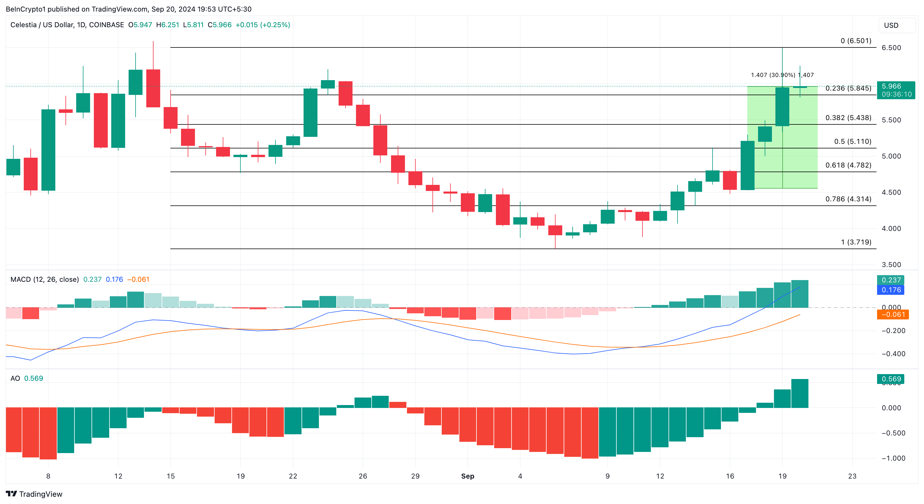 TIAs pris falt kort til $ 4.53 på mandag. Prisen på kryptovalutaen har økt med 30 % siden da, og den handles nå til $ 5.98. En titt på Moving Average Convergence Divergence (MACD) viser en positiv avlesning.