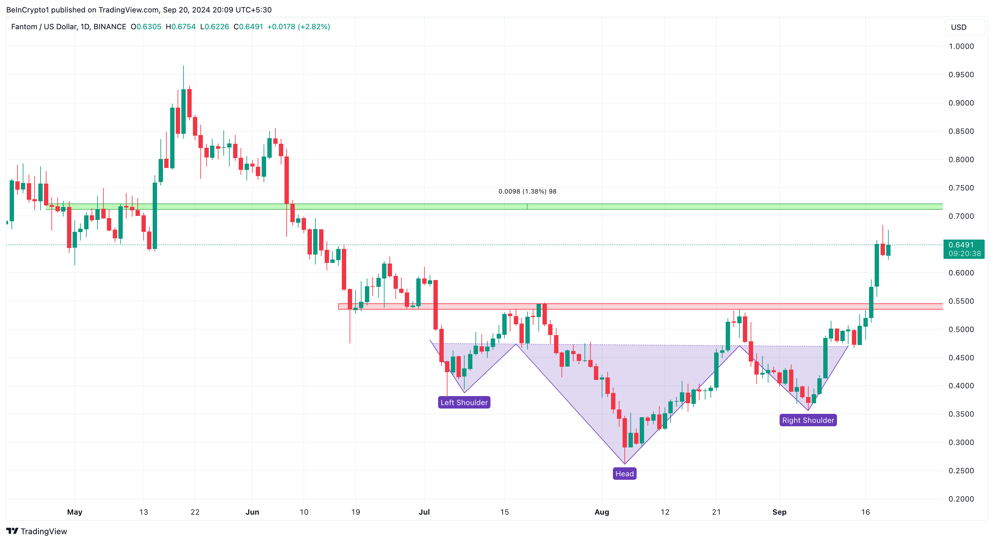 For bare noen dager siden ble FTM handlet under $ 0.50. I dag står den som en av de største altcoin-vinnerne, nå handlet til $ 0.65. BeInCrypto identifiserte et invers hode-og-skuldre-mønster på det daglige diagrammet, en teknisk indikator som signaliserer slutten på en nedadgående trend og starten på en bullish trend.