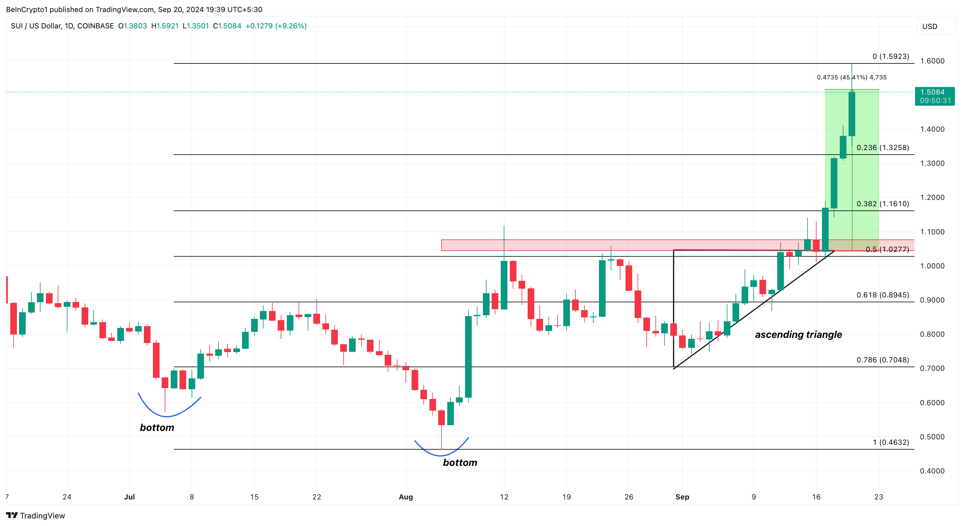 Fra et teknisk synspunkt ble SUIs gjennombrudd drevet av dannelsen av et dobbeltbunnsmønster, som signaliserer bullish momentum. I tillegg viser det daglige diagrammet en stigende trekant, noe som ytterligere forsterker denne bullish trenden.