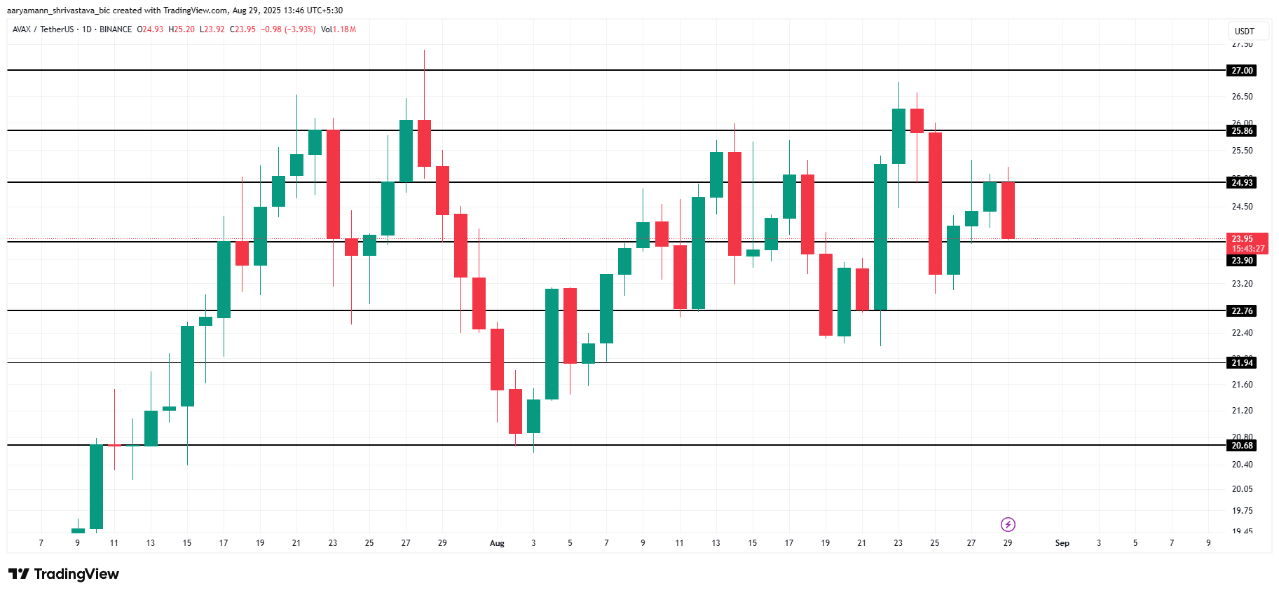 På nedsiden forblir Avalanche sårbar hvis salgspresset vedvarer. Et brudd under $ 23,90 støtte kan utsette AVAX for ytterligere tap, og sende prisen mot $ 22,76. Denne nedgangen vil ugyldiggjøre den bullish utsikten.