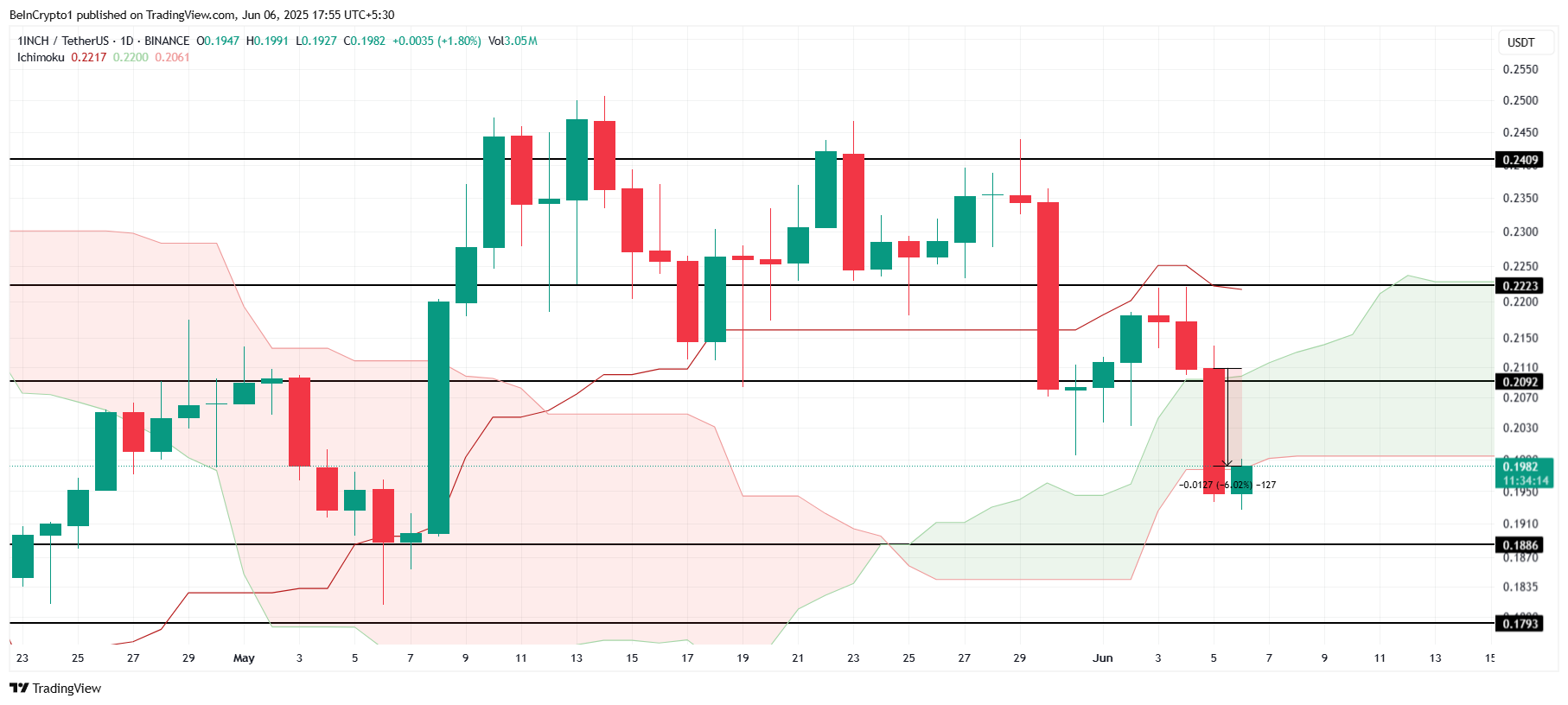 Til tross for å ha falt 6 % de siste 24 timene, og handles til $ 0,1982, viser 1INCH tegn til oppgang. Ichimoku Cloud indikerer vedvarende bullish momentum, som kan hjelpe med å presse prisen over det avgjørende støttenivået på $ 0,2092. Dette støttenivået vil være nøkkelen til å bestemme prisretningen.