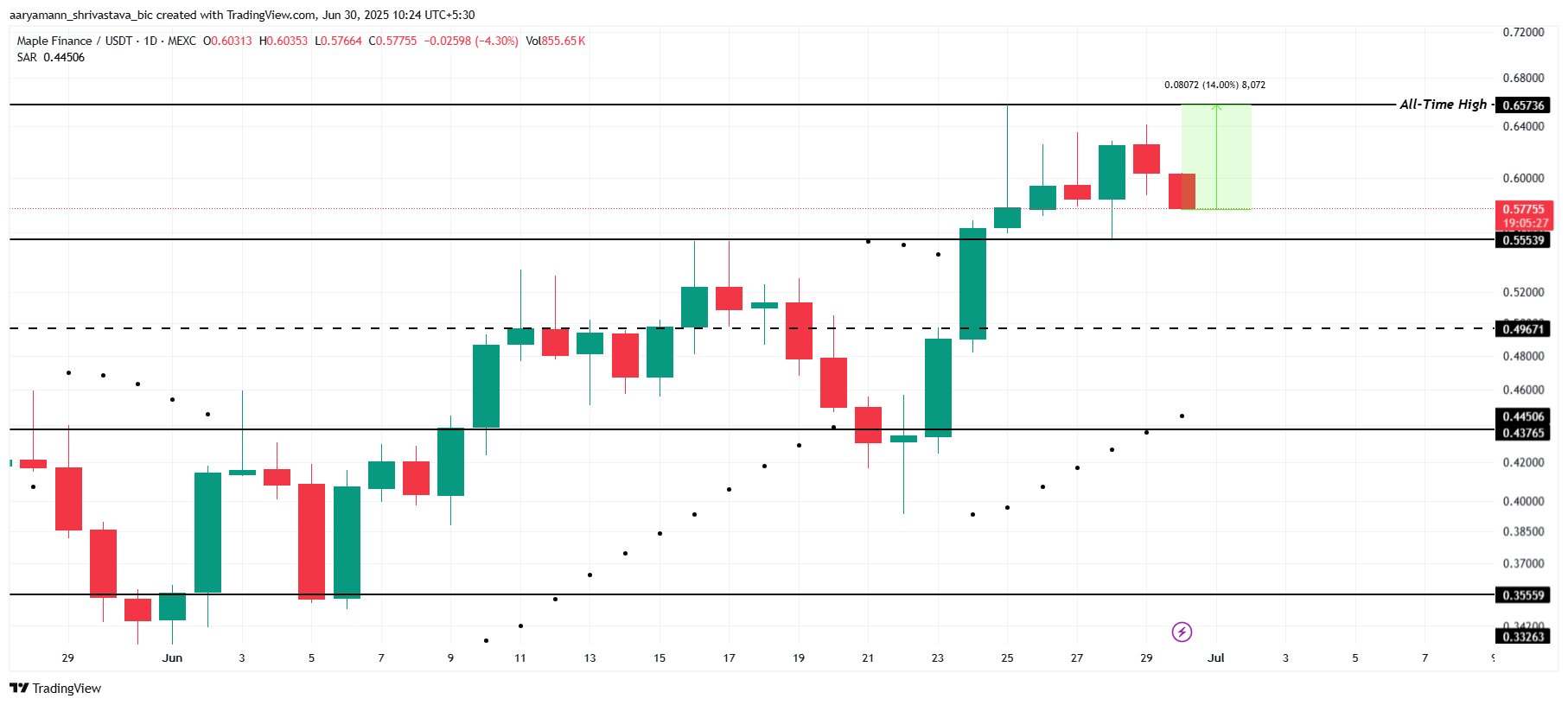 SYRUP er for øyeblikket 14 % unna sin all-time high på $ 0,657. Med en gjennomsnittlig daglig bevegelse på 4 % til 5 %, har denne altcoinen potensial til å nå nye høyder. Gitt de nylige prisfluktuasjonene, er SYRUP godt posisjonert til å bryte sin ATH med fortsatt momentum og markedsstabilitet.